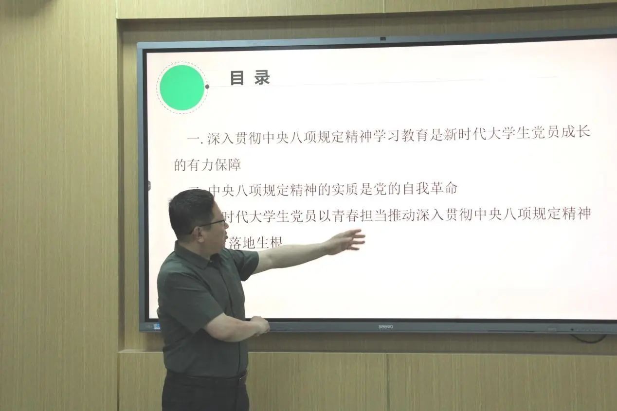 在主题阐述环节,修蕾从三个维度解读“深入贯彻中央八项规定精神学习教育与大学生党员成长”的深刻内涵。他强调,深入贯彻中央八项规定精神学习教育是新时代大学生党员成长道路上的坚实保障。中央八项规定精神的实质,是中国共产党刀刃向内的自我革命,其核心目标在于改进工作作风、密切联系群众,筑牢党与人民群众之间牢不可破的血肉联系。新时代的大学生党员,应当勇立时代潮头,主动肩负起青春使命,推动中央八项规定精神学习教育在校园落地生根、开花结果。