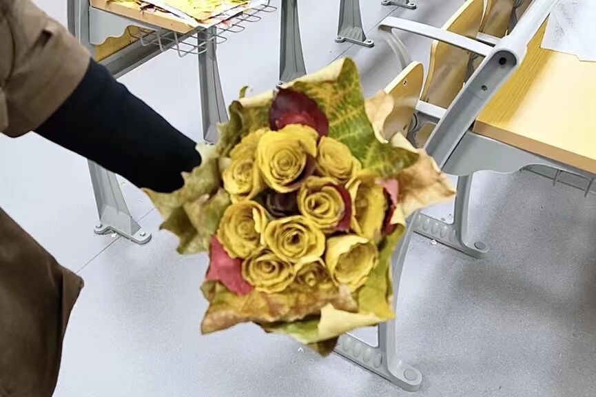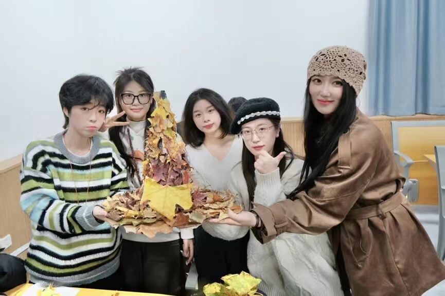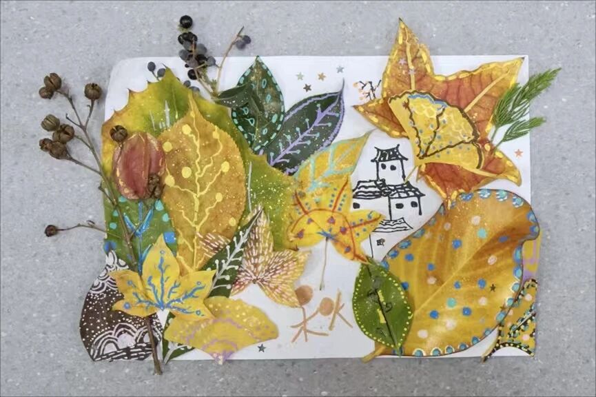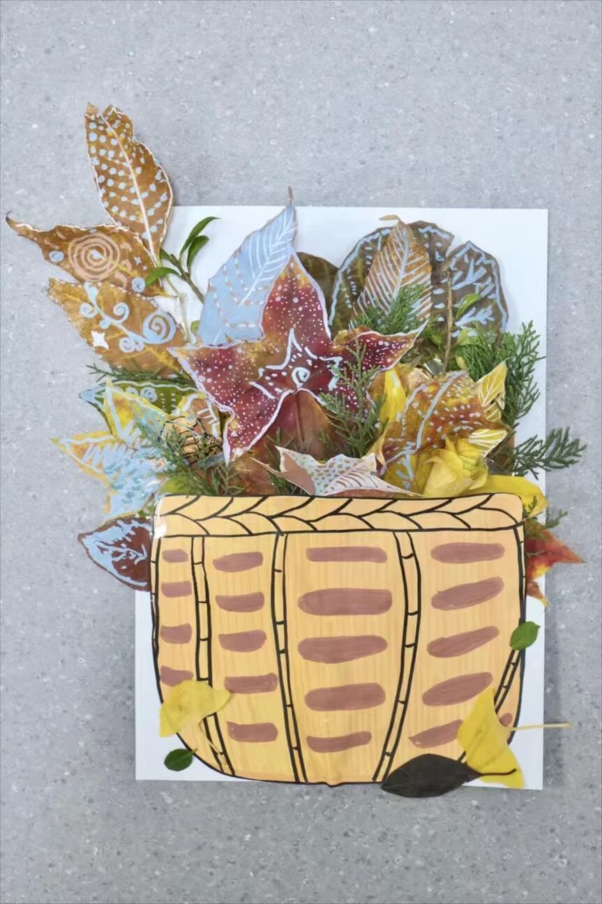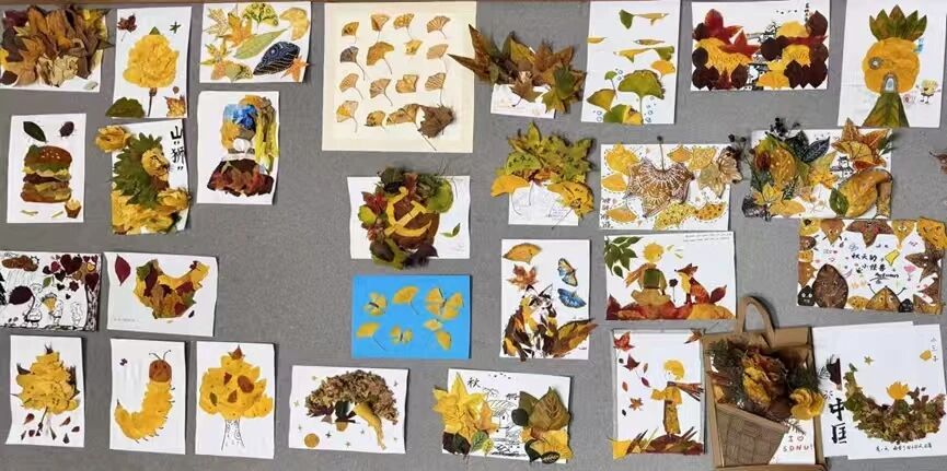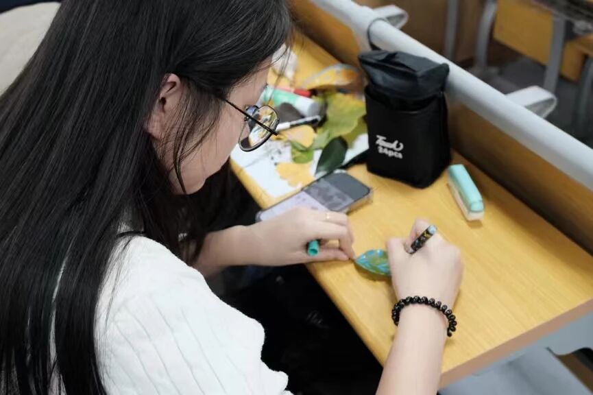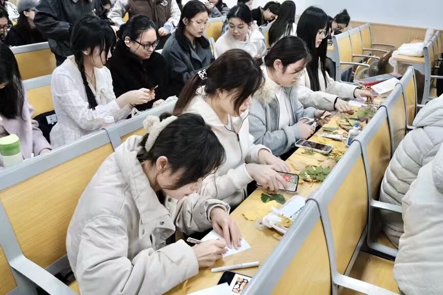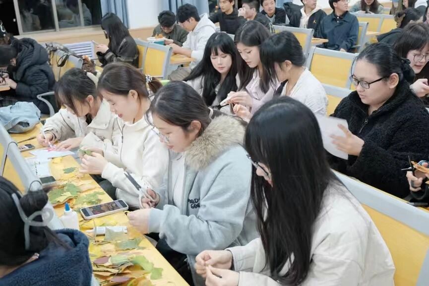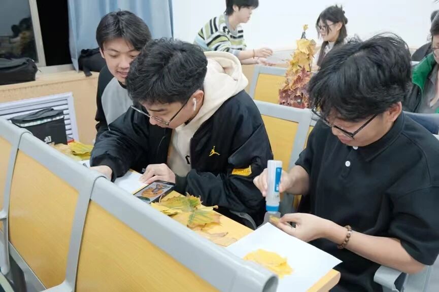 “一叶落而知天下秋”,活动现场,同学们以落叶为材、以秋意为题,让自然的馈赠在巧思中焕新。拼贴重构秋景、拓印定格叶脉,每件作品皆藏对秋的感知与温情。同学们协作交流,互启灵感,使整个教室沉浸在物我两忘的创作氛围中,让秋的意趣与青春创造力相映成辉。