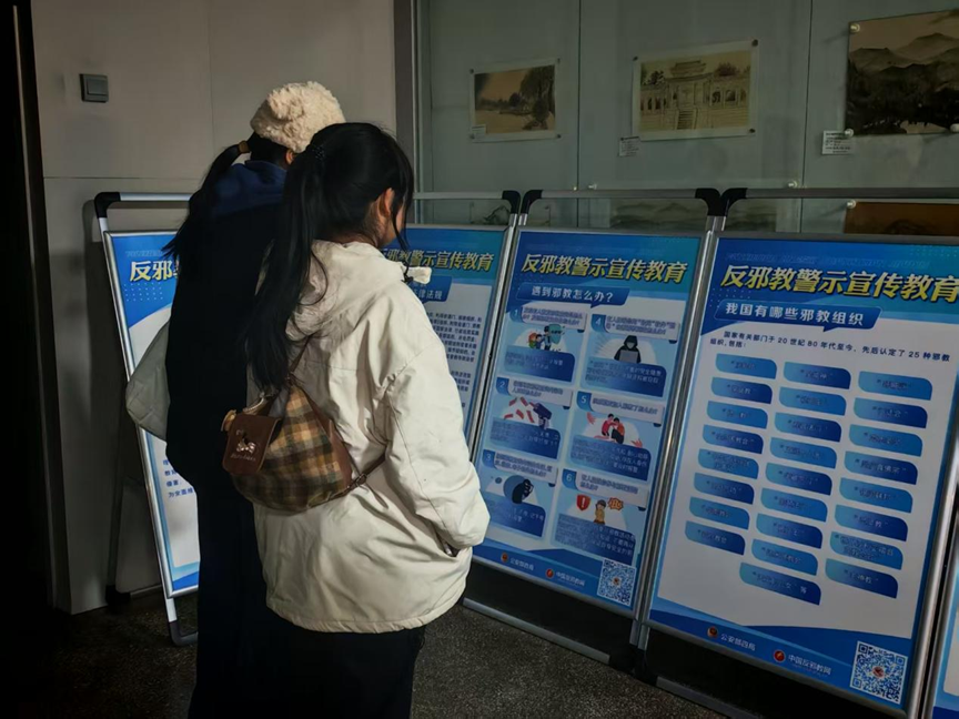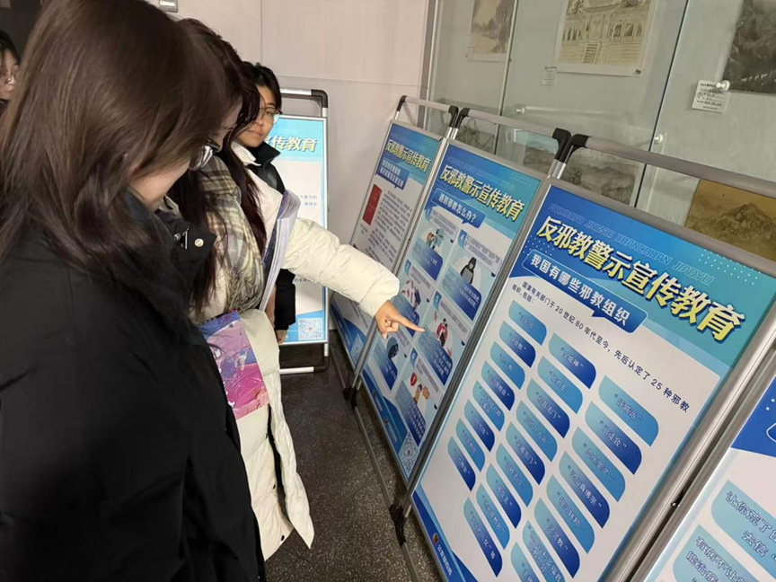 活动现场布置了多组反邪教警示展板,内容丰富,涵盖了邪教组织的基本情况、相关法律法规、典型警示案例、常见伪装手法及实用防范知识等多个层面。展板从法律法规角度,明确区分了合法宗教活动与邪教组织的本质差异,进而剖析了邪教利用宗教外衣进行精神控制和非法敛财的运作模式及其欺骗性本质。展板指出了公民应当知晓的法律底线和行为红线,为观展师生敲响了思想上的警钟。
