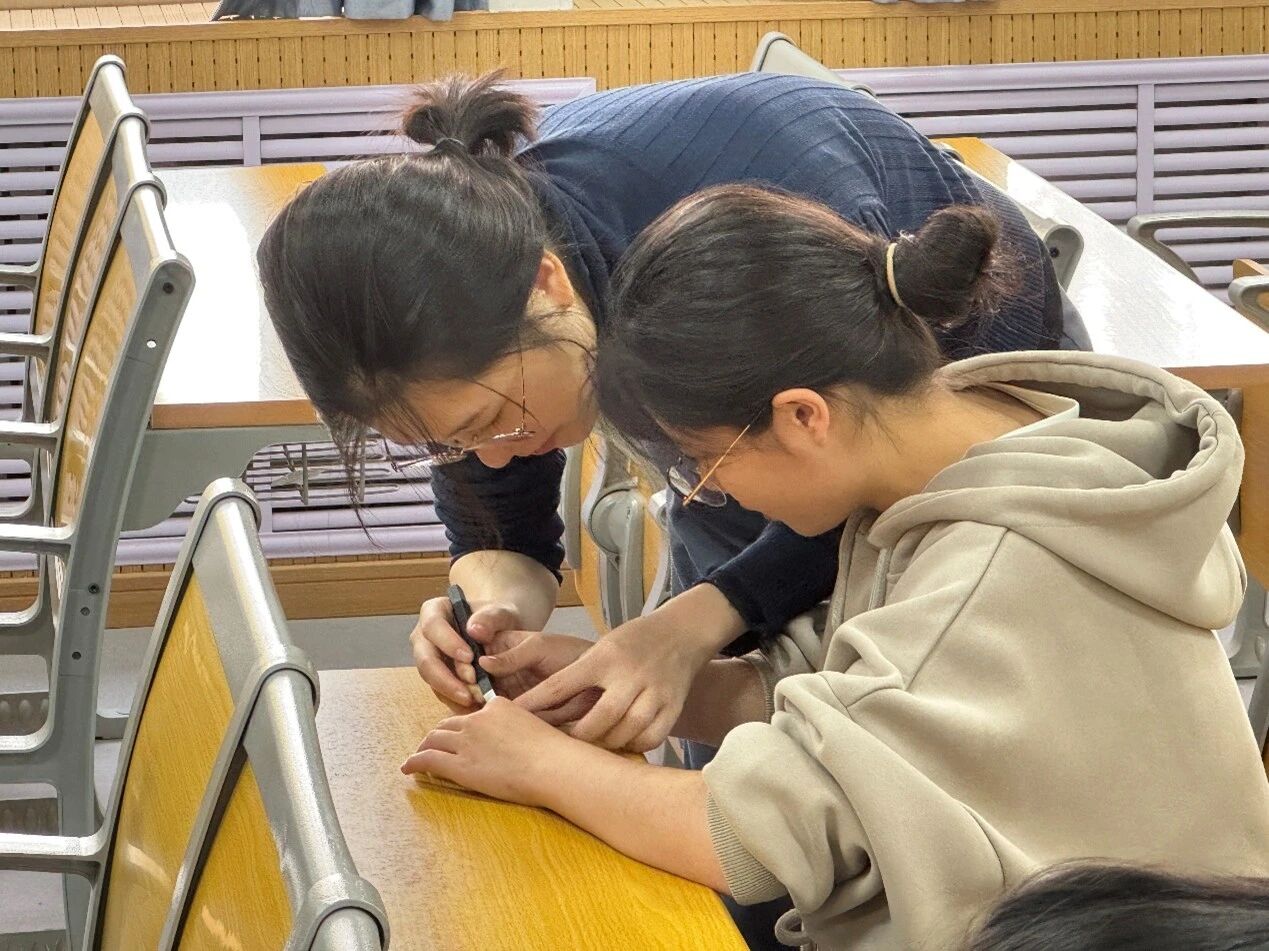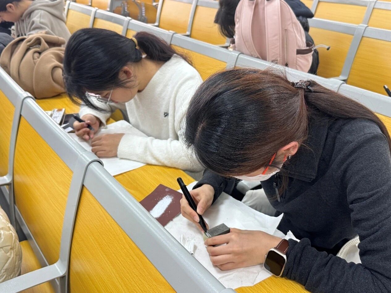 活动中,彭莹莹围绕篆刻实践,系统讲解刻一方印章的流程,重点讲解执刀姿势、用刀角度对笔画形态的影响,后结合实际操作进行示范。社团成员认真聆听讲解,观看示范,随后操刀尝试,体验从单刀、双刀到印文的完整过程。刻刀与印石相触的清脆声响中,所有参与成员全神贯注,完成了自己的第一方印章。