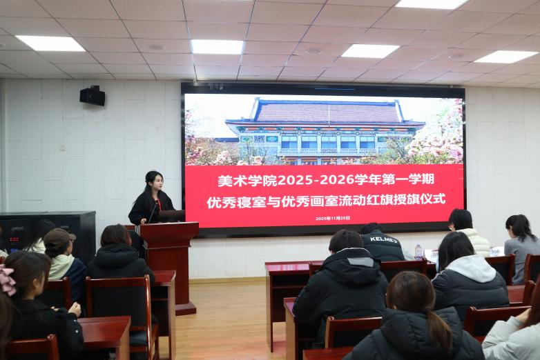 为发挥先进典型示范引领作用,营造积极向上的集体氛围,11月25日,美术学院于千佛山校区教学二楼2126室举办2025-2026学年第一学期优秀寝室与画室流动红旗授旗仪式。22级本科生辅导员王书艳、23级本科生辅导员郑东方、25级本科生辅导员刘晓瑞出席活动,全体受表彰寝室与画室代表参加,研究生会权益服务部负责人李依琳主持。