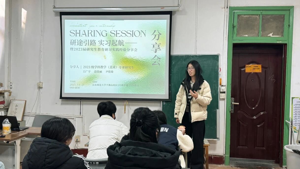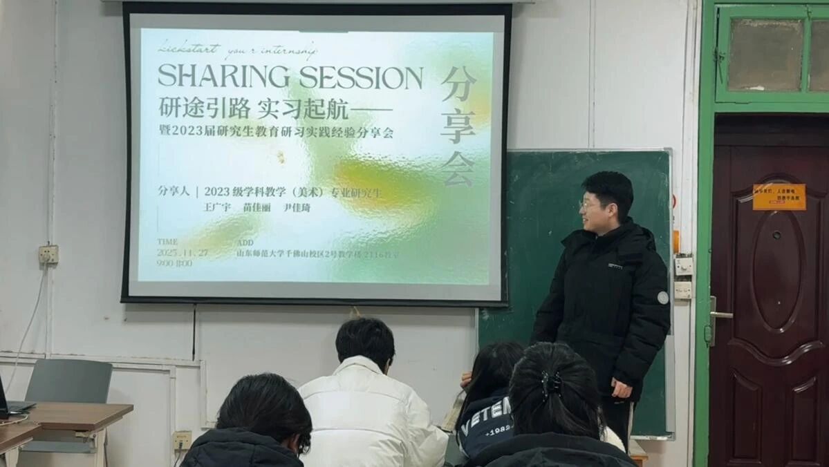 11月27日,美术学院于千佛山校区教学二楼2116室举办2023级学科教学(美术)专业研究生教育研习经验分享会。本次会议由学科教学(美术)专业学位点负责人李民主持,2023级研究生王广宇、苗佳丽、尹佳琦担任分享人,2024级全体学科教学专业研究生参与学习。