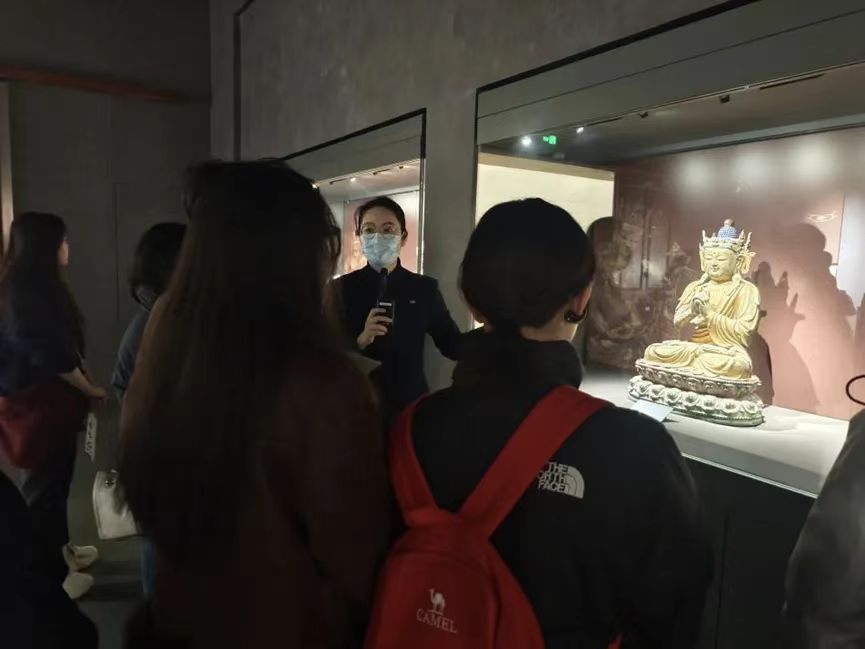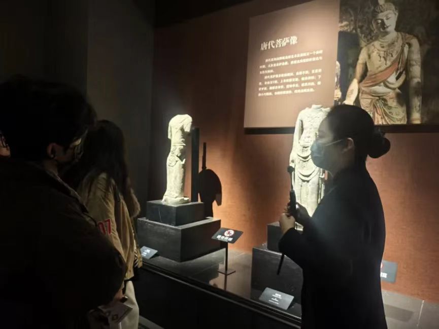 在1号佛教造像展厅,讲解员围绕北魏、北齐等时期的造像珍品,从造像的衣纹褶皱、面部表情到材质选择等方面展开细致解读,重点分析了山东地区佛教造像“秀骨清像”“褒衣博带”的艺术风格与地域文化融合特征。研究生们近距离观察佛像的比例结构与光影效果,理解造像艺术中“形神兼备”的表现手法。