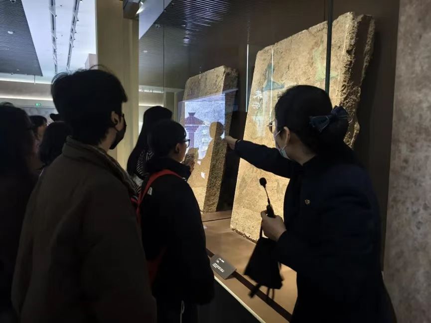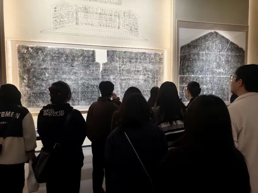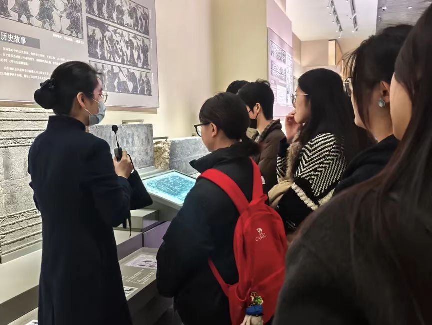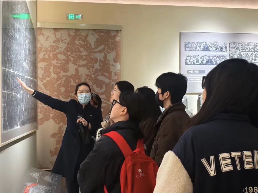 随后,跟随讲解员前往汉代画像石展厅。展厅内,一块块镌刻着精美图案的汉代画像石整齐排列,“车马出行”“乐舞百戏”“农耕渔猎”等生动场景,生动再现了汉代山东地区的社会生活风貌。讲解员详细解析了线刻、浮雕等技法在画像石中的应用,以及汉代世人的宇宙观念与民俗文化内涵。研究生们驻足凝视画像石中刚劲有力的线条、简洁生动的构图并查阅资料,为后续教育实践积累了新的感悟与思考。现场,研究生们还围观了展厅里的电子互动屏,通过数字技术放大画像石细节,直观感受古人“以石为纸、以刀为笔”的创作智慧。