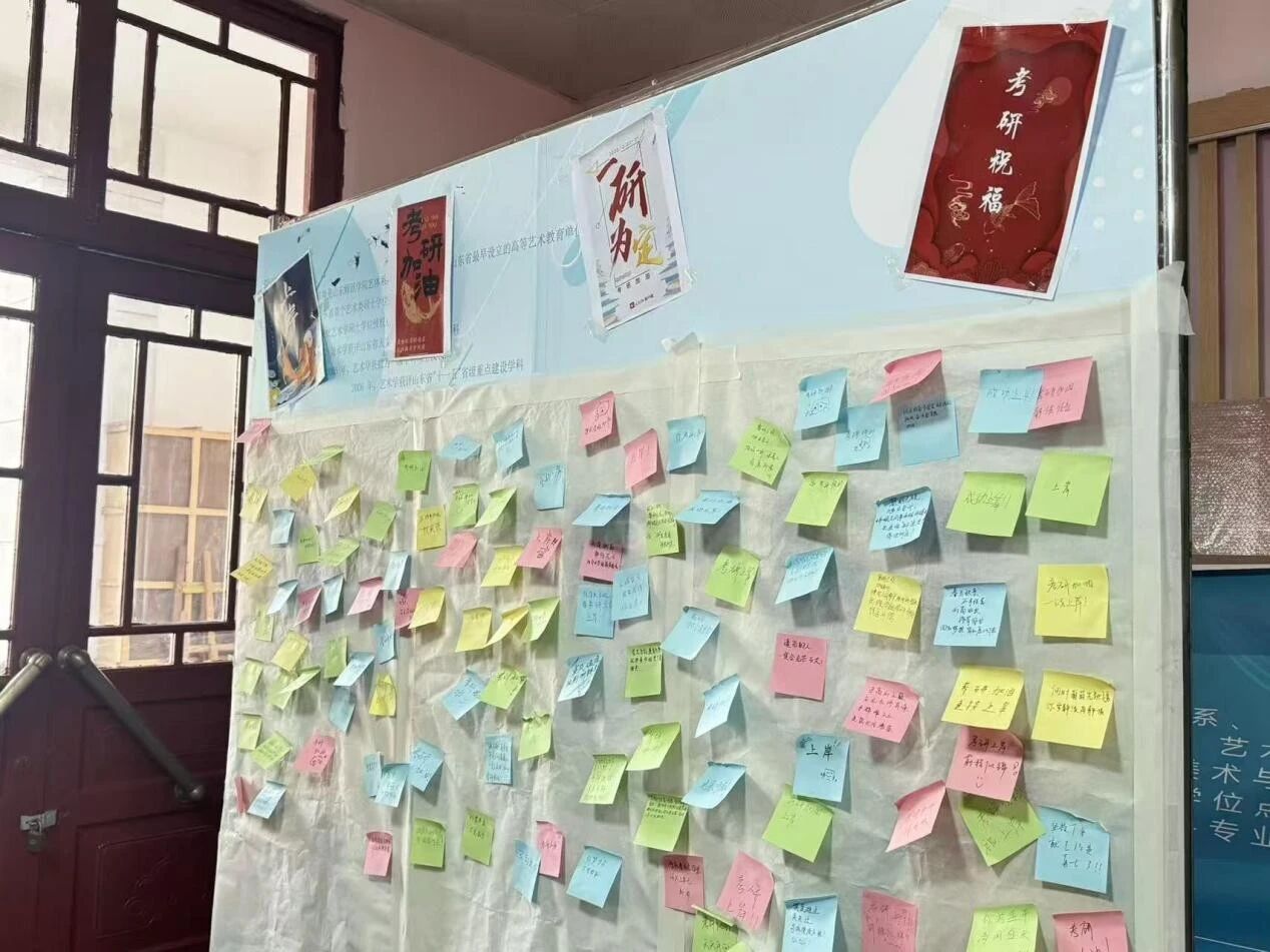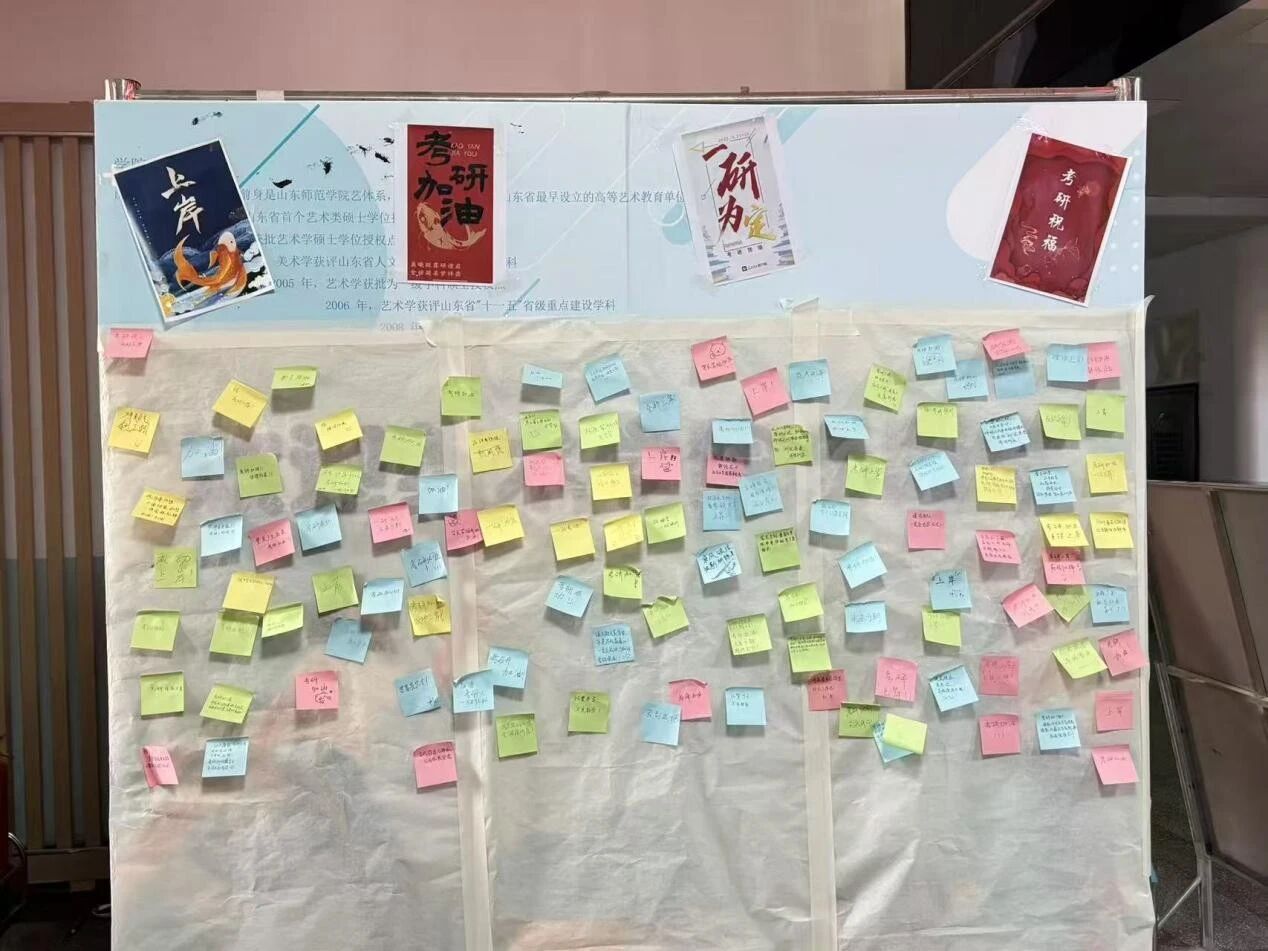 为营造温馨向上的备考氛围,传递对考研学子的深切关怀,12月5日中午,美术学院于千佛山校区教学二楼大厅开展了考研加油墙主题活动。活动吸引各年级同学踊跃参与,大家以真挚寄语为逐梦学子加油鼓劲,凝聚起守望相助的青春力量。