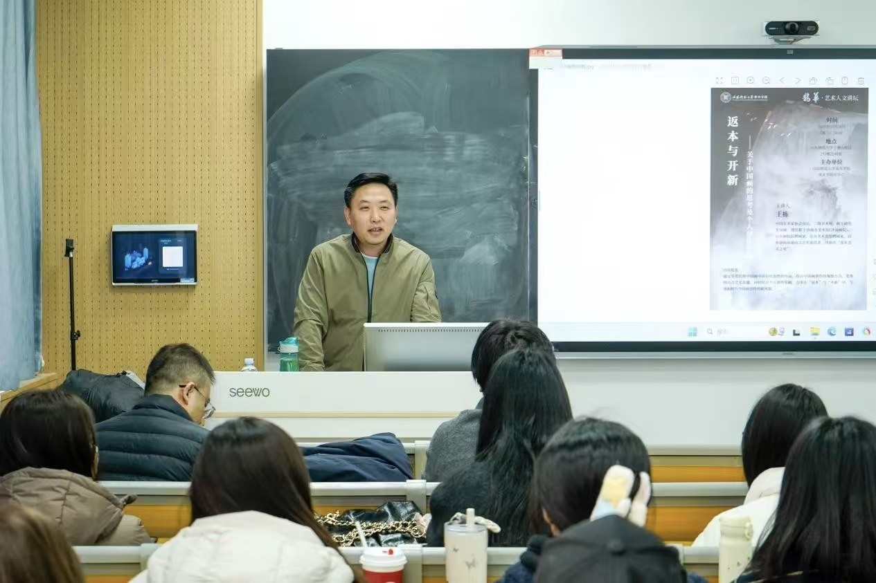 12月10日下午,美术学院于千佛山校区教学二楼2248教室举办“返本与开新——关于中国画的思考及个人创作实践”专题讲座。本次讲座特邀中国美术家协会会员、二级美术师、硕士研究生导师、济南市美术馆(济南画院)专职画家王栋担任主讲,美术学院教授、博士生导师董龙昌主持本次讲座,学院部分博士、硕士研究生及社会艺术爱好者参与讲座。