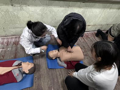 此外,培训内容还学习了止血包扎和气道梗阻急救这两项实用技能,现场示范了螺旋包扎、三角巾悬挂等多种包扎方法,并总结了“剪刀、石头、布”的气道梗阻急救手势口诀,帮助同学们迅速理解和掌握操作要点。