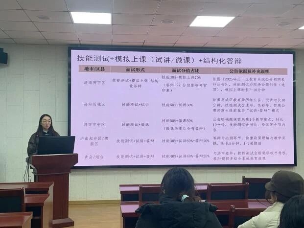 培训会上,魏晓宇围绕面试全流程展开系统讲解。从面试基本信息中的常见形式、时长要求、成绩构成,到历年面试内容中济南各区县技能测试的不同侧重,再到面试要点解析里试讲、技能测试、答辩的核心考察维度等等,魏晓宇均进行了全面且细致的拆解。针对美术学科特性,她重点梳理了试讲中的教学设计、专业素养展现、教学基本功等核心考察点,结合答辩中的高频问题类型、答题逻辑与应急处理技巧,通过案例分析、要点提炼的方式,帮助同学们搭建起清晰的面试知识框架,破解备考中的核心困惑。