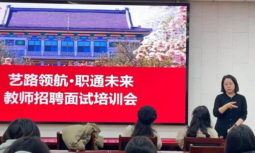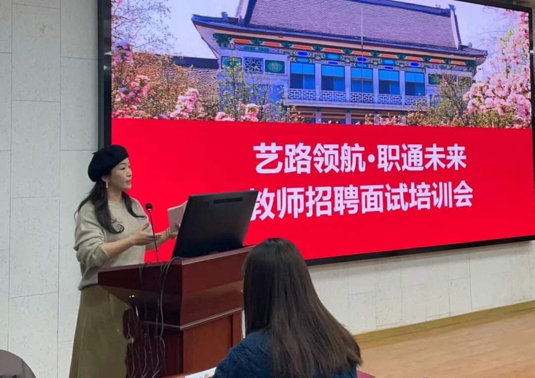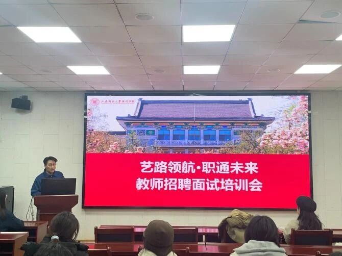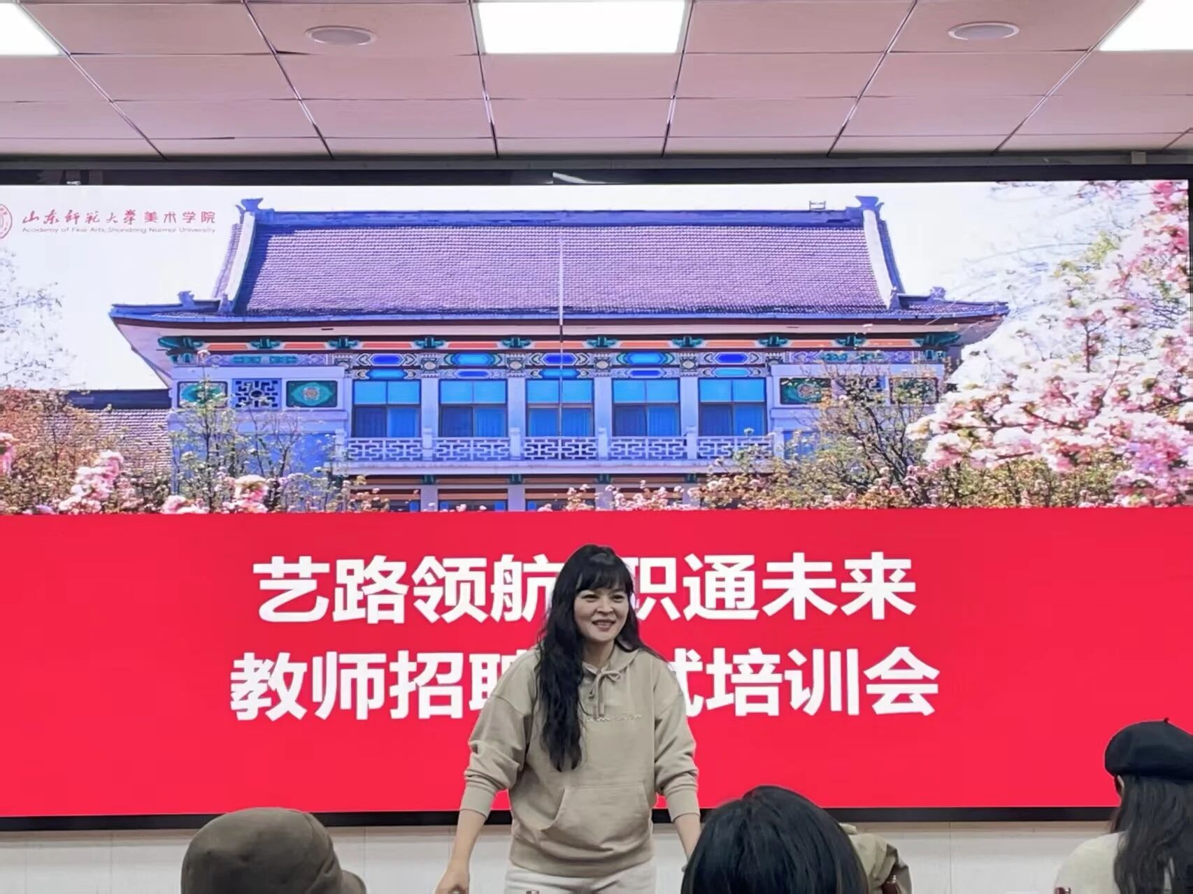 为切实提升美院学子报考教师编岗位的面试答辩核心能力,为其职业发展筑牢根基,1月16日下午,美术学院于千佛山校区教学二楼2126教室举办了“艺路领航・职通未来”教师编招聘面试培训会。本次培训会由博士研究生魏晓宇担任主讲人,美术学院党委副书记、纪委书记葛晓霞,团委书记李明,美术教育系主任王海燕,美育实践工作部主任焦伟,美术教育系副主任李晓娣作为指导老师全程参与,精准对接学子求职需求,为有美术教师职业规划的同学送上了一场干货满满的面试指导盛宴。
