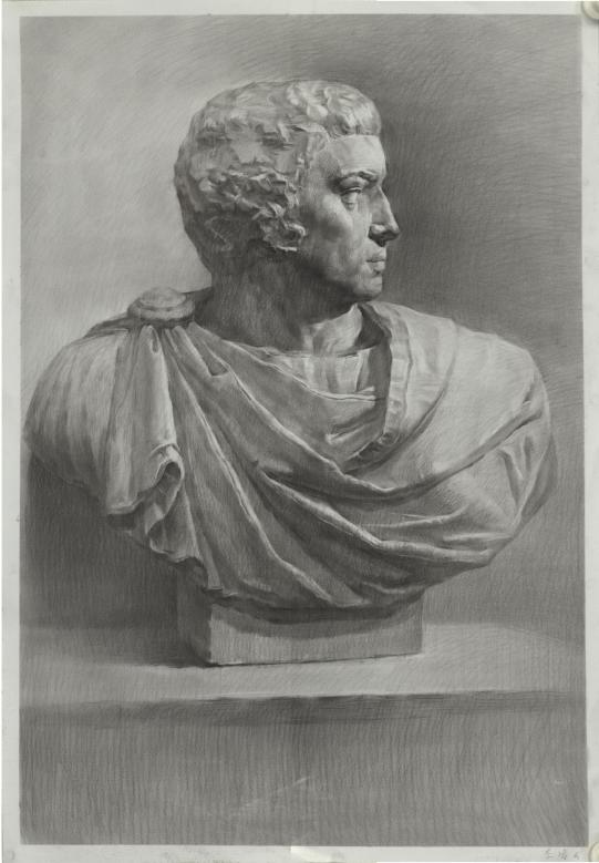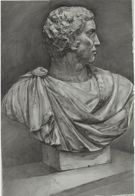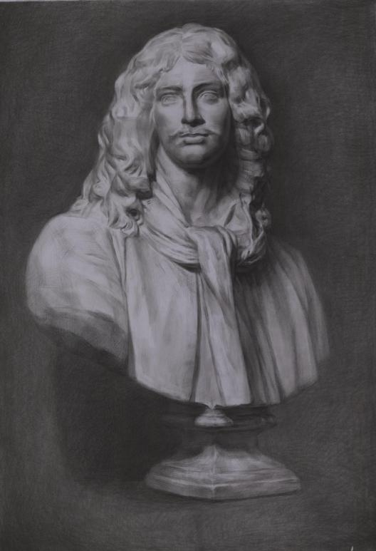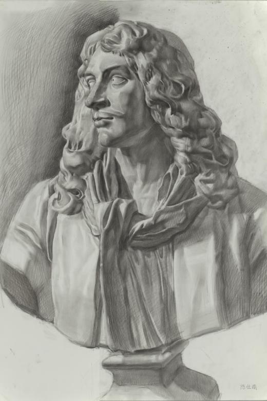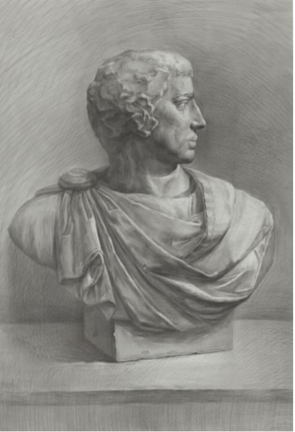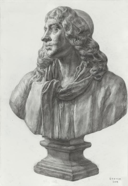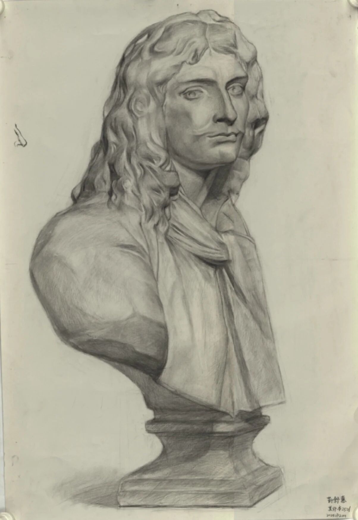 对着石膏像静坐写生,光影明暗间落笔,一笔一画皆是专注,心在描摹里沉静,与静物默然相望。经过与石膏像面对面的交流,更能感受到在空间中的形体转折,空气透视带来的形变与人类眼球弧度下的真实视角,与往日画照片相比更加具有朴素生动的味道,纯粹的写生感。