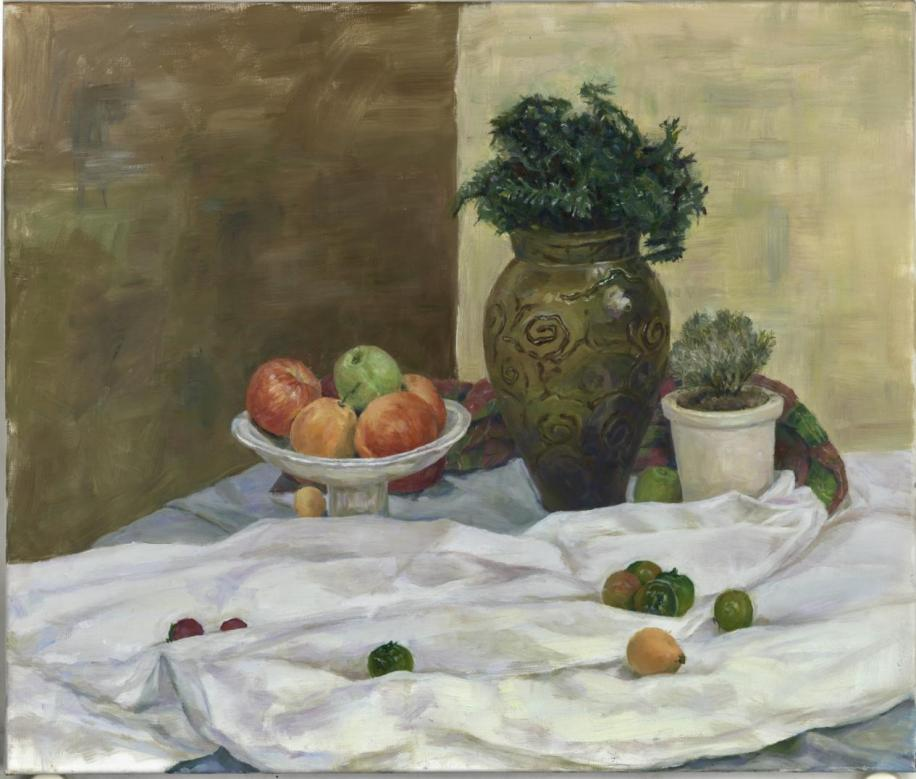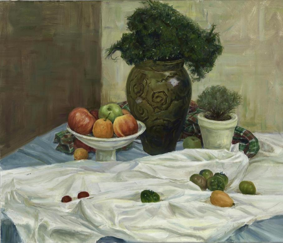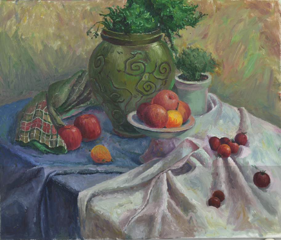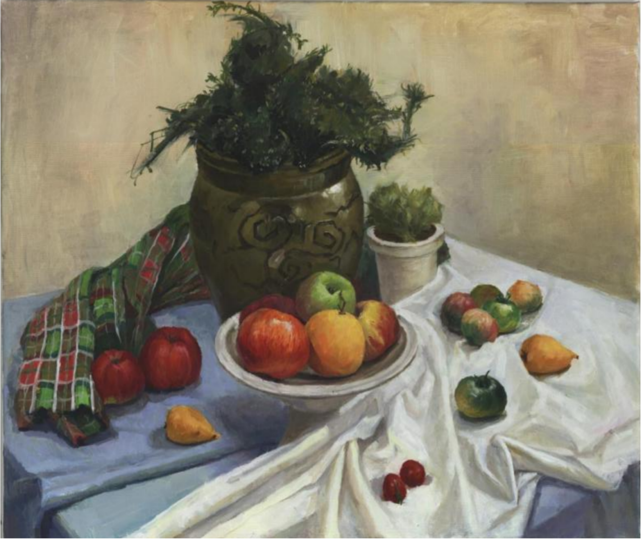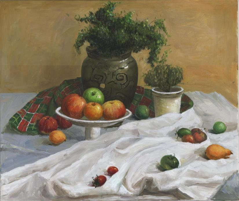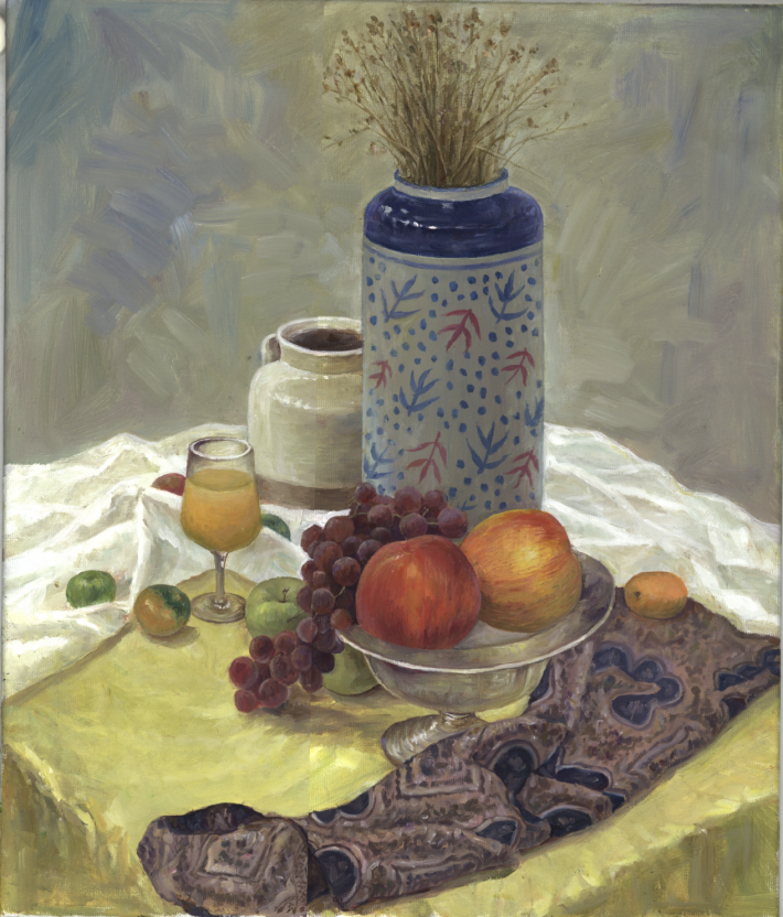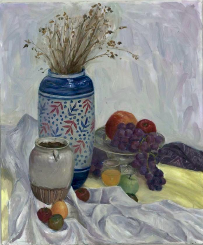 画石膏人物的这段时间,我全神贯注在排线和明暗上。从额头的起伏到鼻梁的轮廓,每一笔都得仔细对照石膏的结构。反复修改、擦拭,才慢慢让平面的画纸有了立体的感觉。这次写生让我知道,素描不只是描形状,更要抓住物体的骨架和光影的规律。我会特意观察五官联动的变化,而不是孤立地画。这些观察上的调整,让画面的体积感和生动性都比之前好很多。第一次完整画油画静物,手忙脚乱却很有成就感。调颜色时总怕不准,铺色时又担心厚薄不合适。看着陶罐的光泽、水果的质感一点点在画布上显现,特别开心。我尝试了用“整体—局部—整体”的观察节奏,这让画面的氛围感和层次都比之前更统一了。