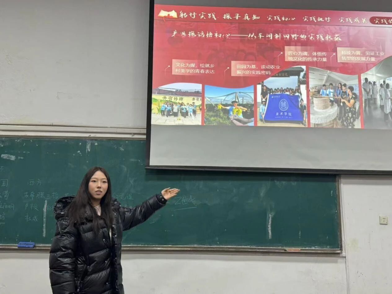 23级本科生代表温佳慧回顾了她带领团队在潍坊临朐嵩山的实践经历。团队通过实地勘测村落风貌,将国画笔墨技巧与乡村文化元素深度融合,创作完成35幅墙绘作品,为传统美术赋能乡村振兴提供了生动鲜活的实践案例。