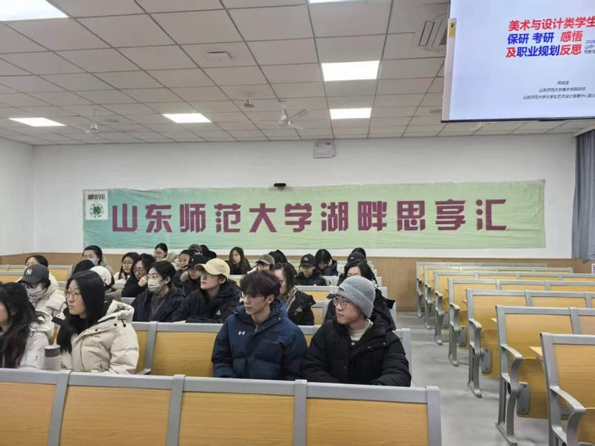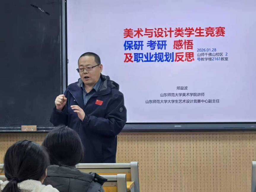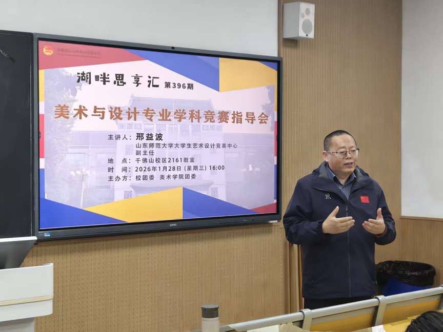 1月28日,由校团委、美术学院团委联合主办的第396期“湖畔思享汇”于千佛山校区二号教学楼2161室举行。本次讲座以“美术与设计类专业学科竞赛指导”为主题,特邀山东师范大学大学生艺术设计竞赛中心副主任邢益波担任主讲人,相关专业同学到场聆听。