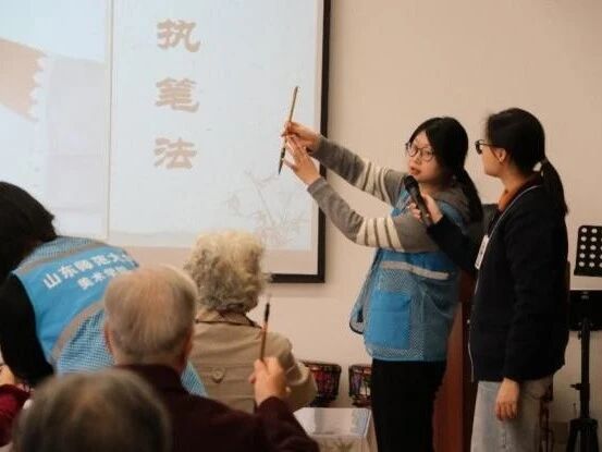 学子们走进济南市槿春泺园养老服务社区,开展“艺暖夕阳红・匠心传温情”国画非遗志愿服务,系统地为老人传授中锋、侧锋等国画基础笔法,演示墨色变化技巧,手把手指导创作细节,让传统艺术走进养老生活,为老年群体带去文化关怀与精神慰藉。