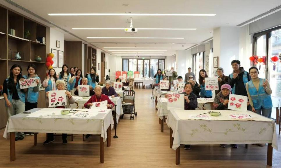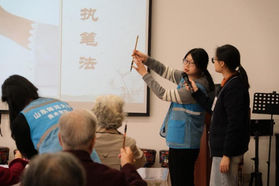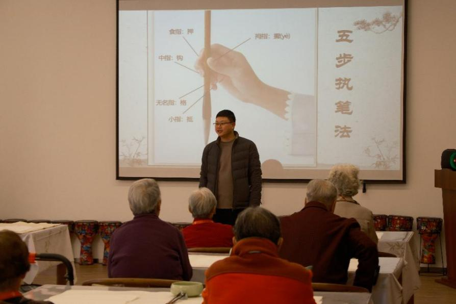 为深入贯彻落实中华优秀传统文化传承发展相关要求,践行尊老敬老的中华民族传统美德,充分发挥高校艺术专业服务社会的职能,2026年1月,美术学院“蒲公英”社会实践服务队在我院团委书记李明的带领下,前往济南市槿春泺园养老服务社区开展寒假社会实践活动。学院研究生志愿者以国画教学为核心载体,走进敬老院开展非遗文化志愿服务,向老年群体系统传授国画墨法技艺与书法基础技能,让传统艺术在敬老服务中焕发新生机。