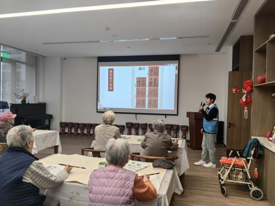 历杨慧子系统讲解了书法体系中篆、隶、楷、行、草等主流字体,帮助老人建立基础的书法字体认知体系。随后以视频教学为核心载体,聚焦书法基础笔法中横画、竖画两大核心笔画,细致拆解起笔、行笔、收笔的规范动作要领,同时示范线条的力度把控、墨色变化与空间占位的基本要求。在视频技法讲解的铺垫下,结合志愿者们的现场指导、笔法纠偏与结体调整,老人逐步将基础笔画技法运用到实践中,完成了“福”字的书写。