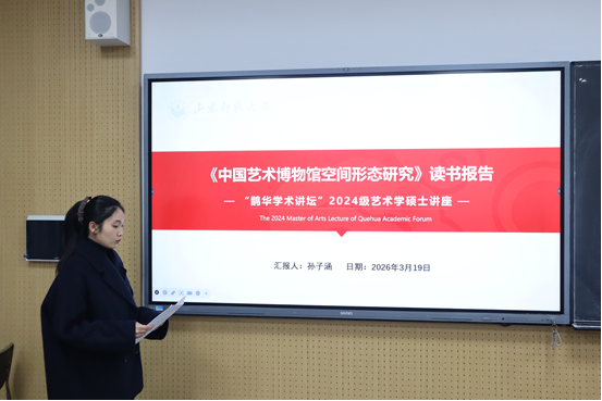 3月19日晚,美术学院于山东师范大学千佛山校区教学二楼2161室举办2026届“鹊华学术讲坛”第一期读书报告会。本次讲座由2024级艺术学硕士研究生孙子涵担任主讲人,美术学院部分研究生到场聆听。