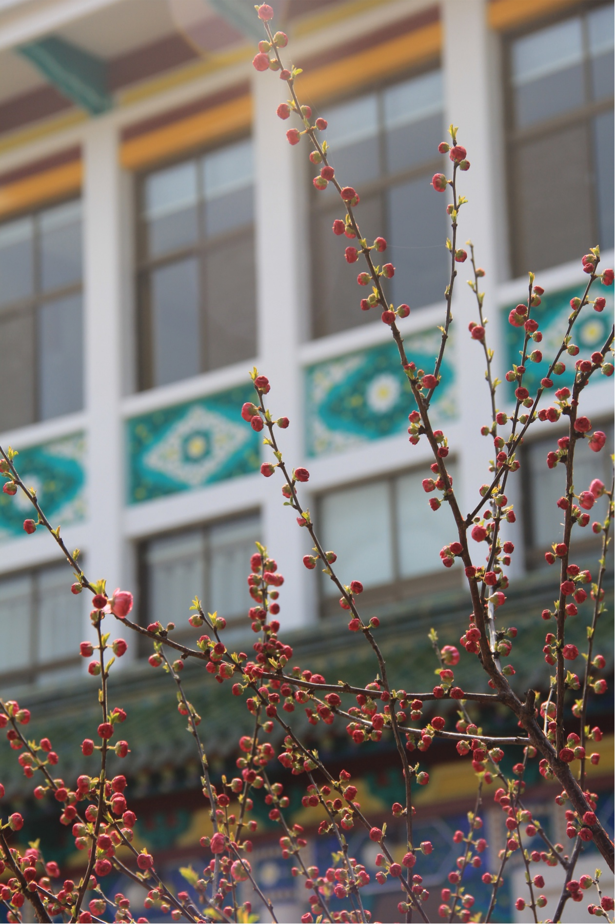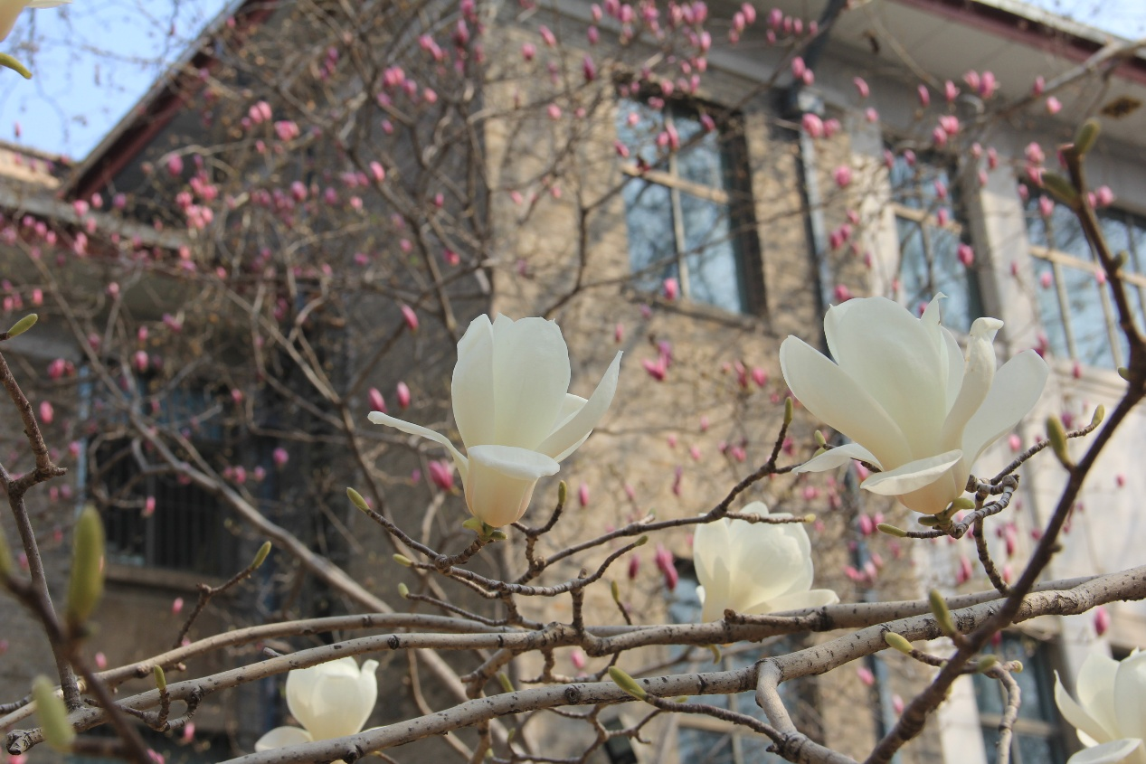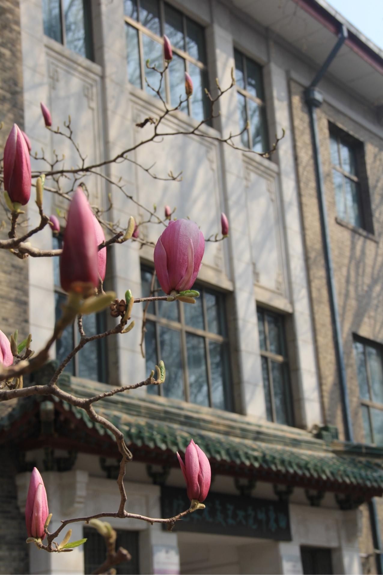 第三教学楼的红梅在枝头俏皮张望,粉瓣儿薄得透光;文化楼前的紫丁香,悄悄把整条路都染香了,风一吹,香气就往人怀里钻;垂丝海棠含苞待放,准备堆起粉色的云,把宿舍楼都衬得温柔了;还有美术学院南边的玉兰,举着盏盏白玉杯、紫玉盏,就等着春雨来斟酒呢。