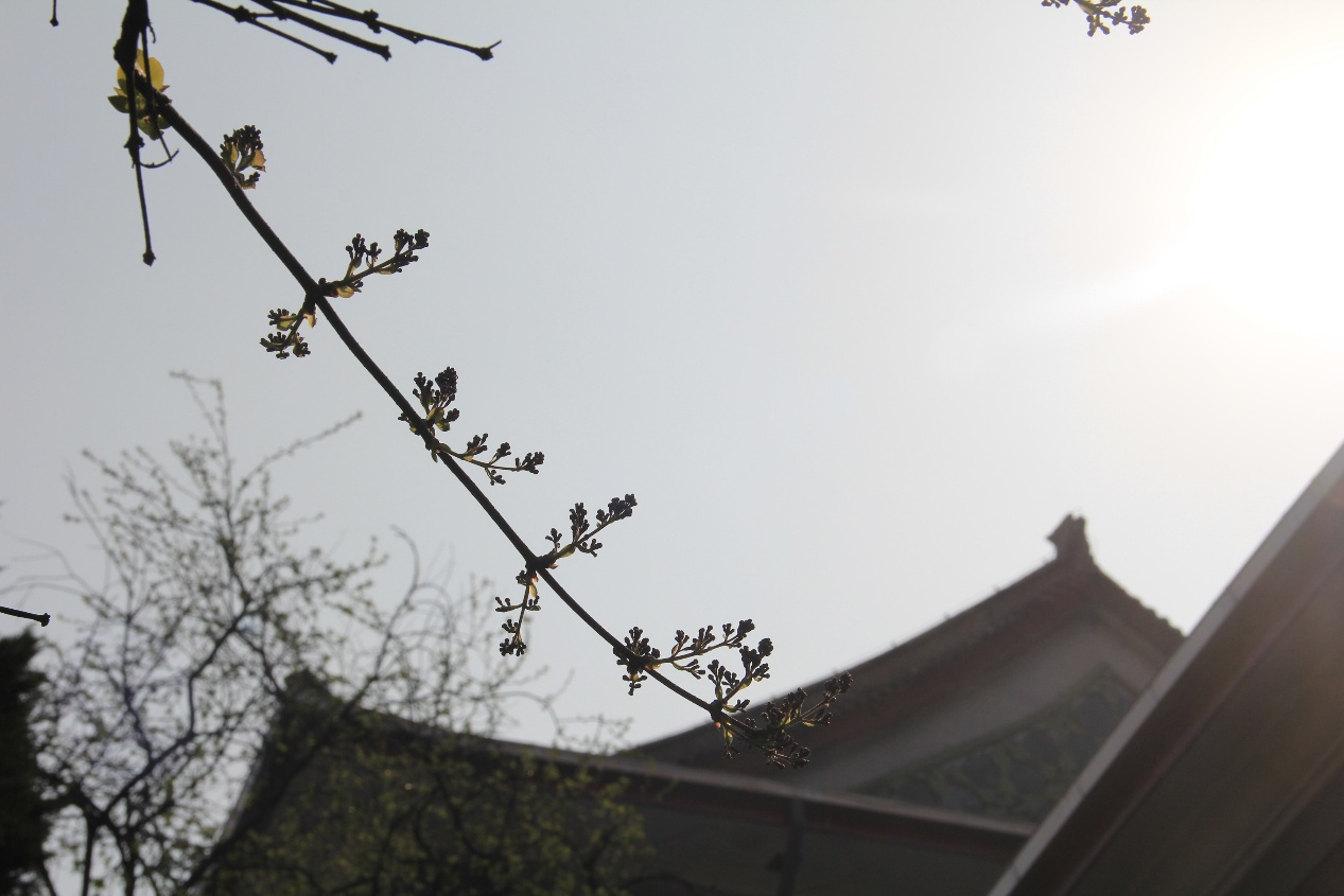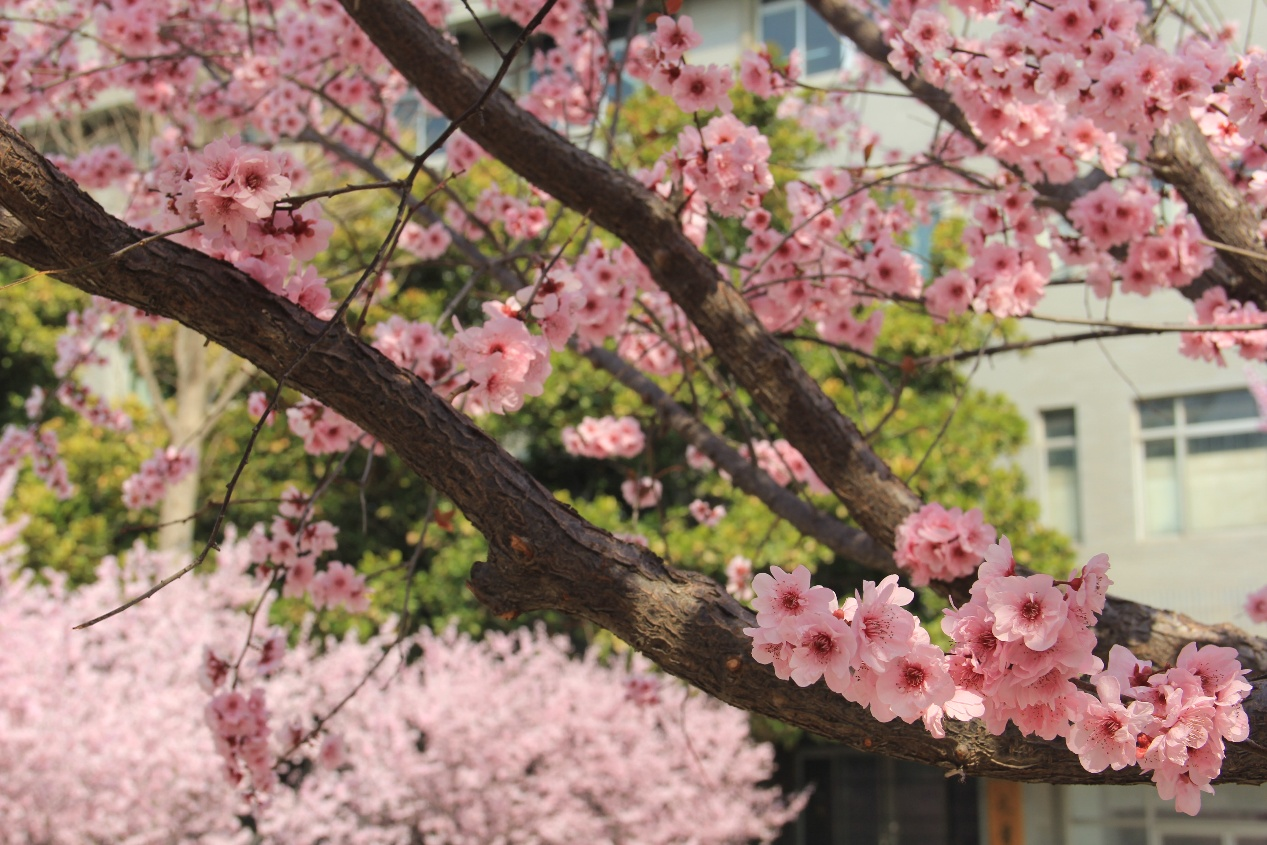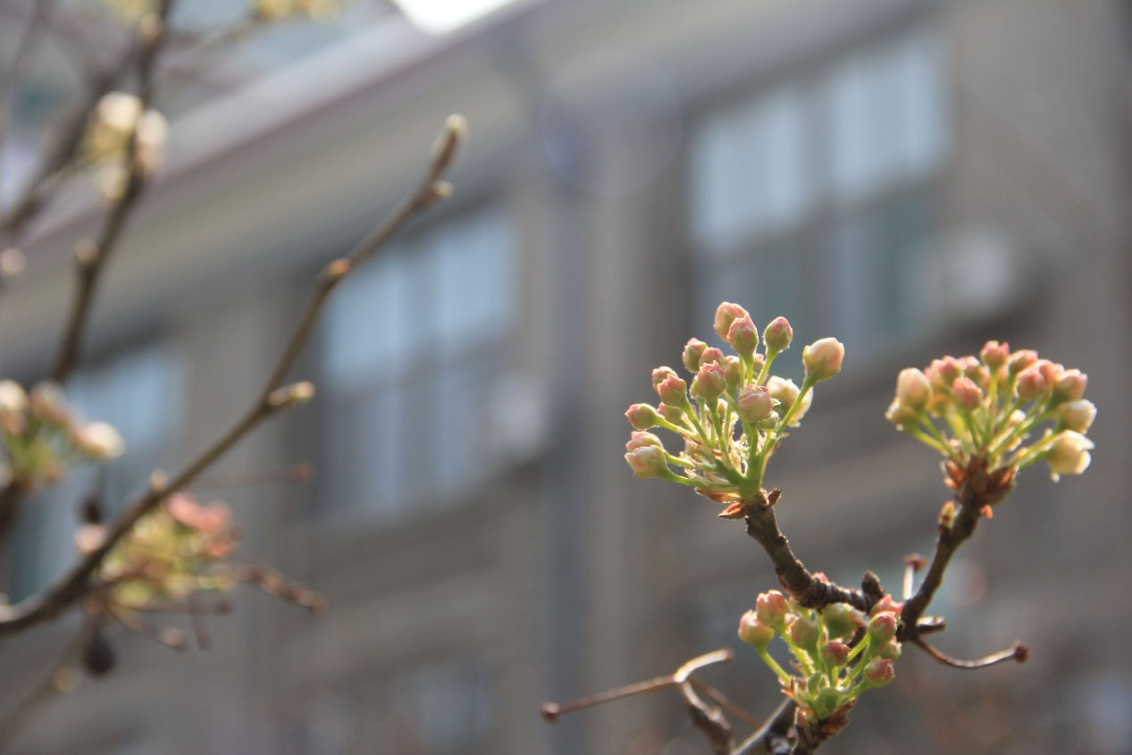 第三教学楼的红梅在枝头俏皮张望,粉瓣儿薄得透光;文化楼前的紫丁香,悄悄把整条路都染香了,风一吹,香气就往人怀里钻;垂丝海棠含苞待放,准备堆起粉色的云,把宿舍楼都衬得温柔了;还有美术学院南边的玉兰,举着盏盏白玉杯、紫玉盏,就等着春雨来斟酒呢。