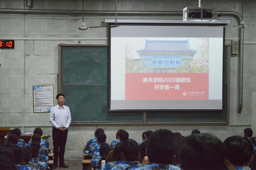 9月6日晚,美术学院2022级本科生开学第一课于千佛山校区教学二号楼2313开讲,第一课由美术学院党委副书记金鹏主讲,2022级全体本科生到场聆听。