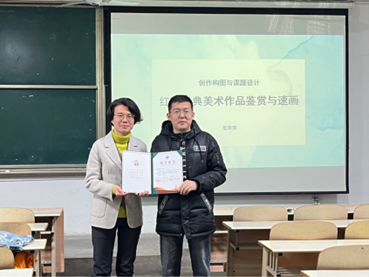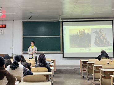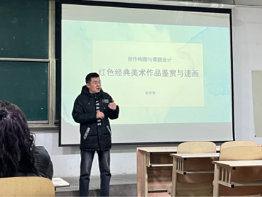 活动开始前,范萍萍老师在其导师团的指导下精心设计了本堂课的教学方案。范萍萍老师以“红色经典美术作品鉴赏与速画”为主题进行创作构图与课题设计的课堂展示,课堂以讲授知识点和学生展示穿插进行。主要讲授了三个部分,分别是金字塔式构图、塑造语言、当代延伸。