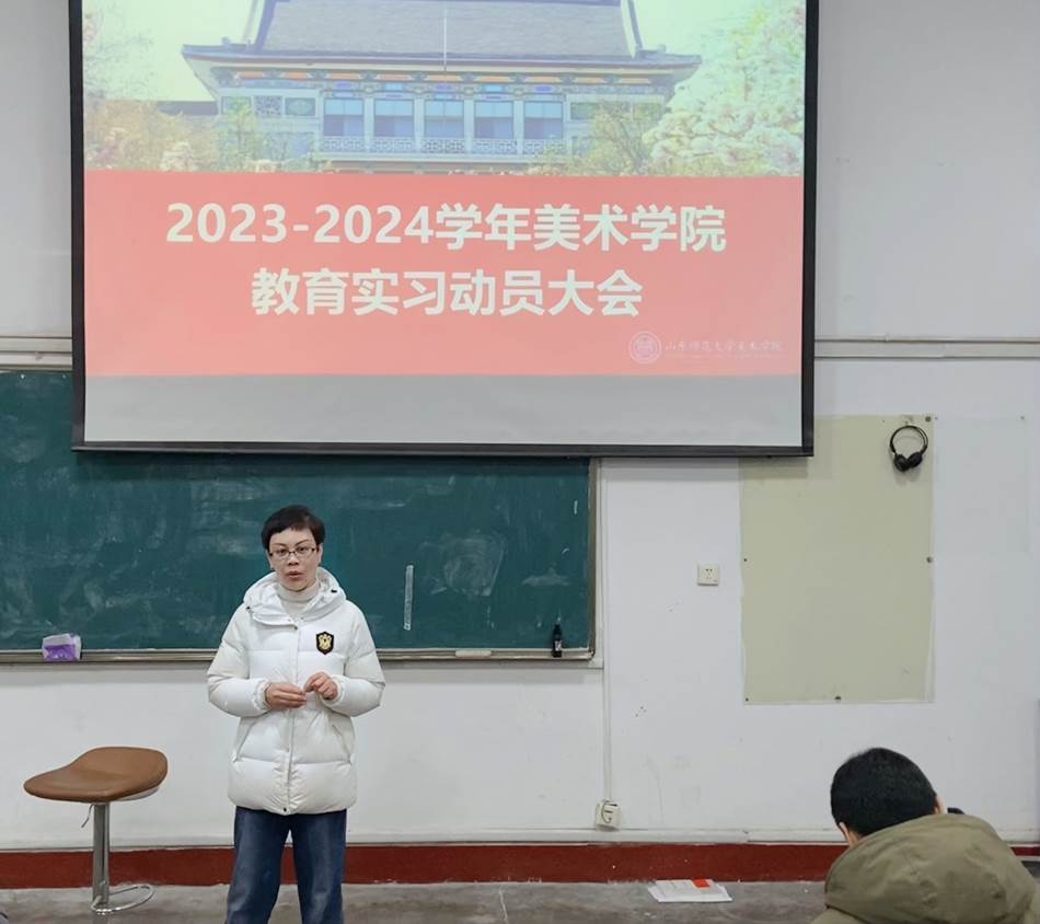 为扎实做好教育实习相关工作安排,保障实习工作顺利开展,1月5日,美术学院于千佛山校区二号教学楼2214举办2021级教育实习动员大会。党委副书记葛晓霞、副院长吴磊、李民,美术教育系主任刘宁以及实习指导教师团队姚理、王海燕、丁翠红、陈金梅、李楠、葛丹、杨春波、赵爽萍,辅导员高银东出席本次大会,2021级全体美术学专业本科生参加,本次动员大会由刘宁主持。