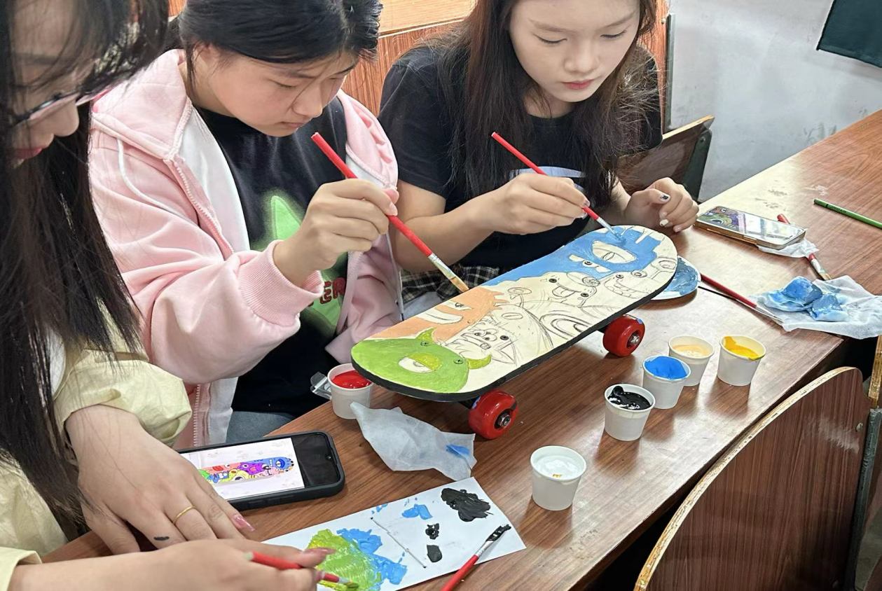 活动现场,同学们挥动手中的画笔,在滑板上尽情挥洒创意,绘制出属于自己的春日色彩。滑板与涂鸦的碰撞,不仅展现出青春的活力与激情,更让同学们在创作中感受到春天的温暖与美好。