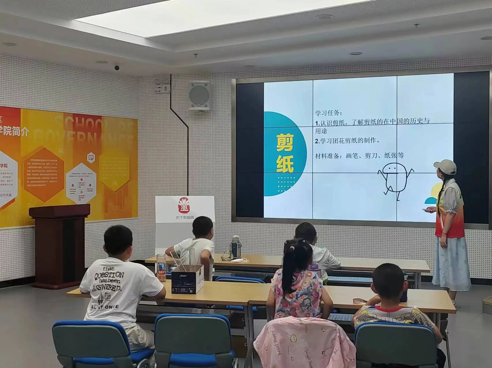 在活动的开始由黄小羽同学为大家科普剪纸的基本知识,孩子们认真的聆听着讲解被活动所吸引,积极回答问题,迫不及待地想要亲手尝试一番。