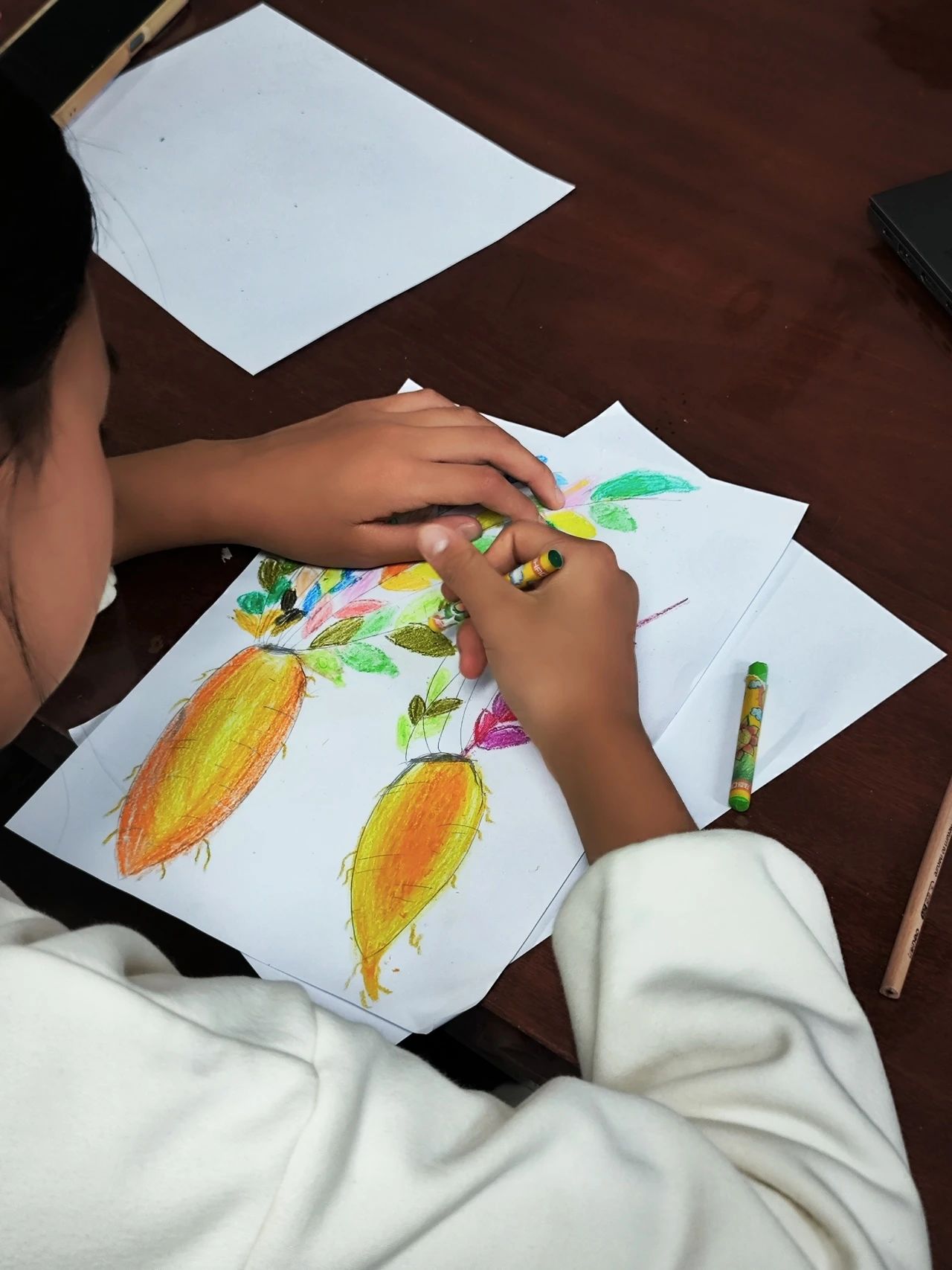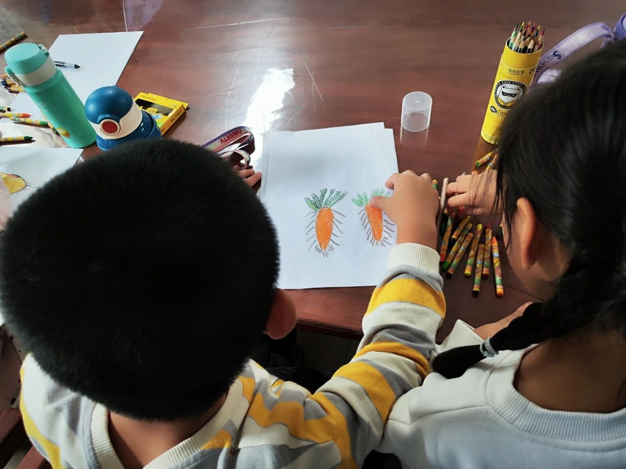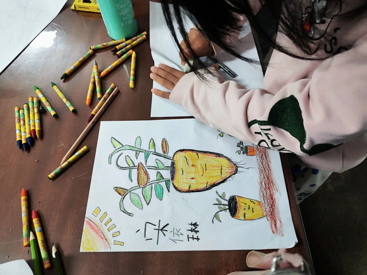 随后,活动进入了儿童绘画环节,在志愿者的指导下,孩子们通过观察霜降萝卜的图片,发挥想象,创作出富有创意和色彩的绘画作品。