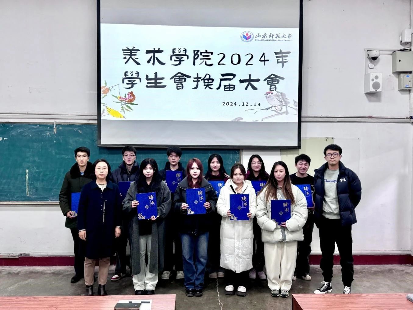 12月13日,美术学院2024-2025学年学生会换届大会在千佛山校区教学二楼2214教室举行。美术学院党委副书记葛晓霞、团委书记丁彬、辅导员郑东方、王书艳、高银东、宋俐志参加活动。学生会全体成员到场参加。会议由主席团成员叶子恒主持。