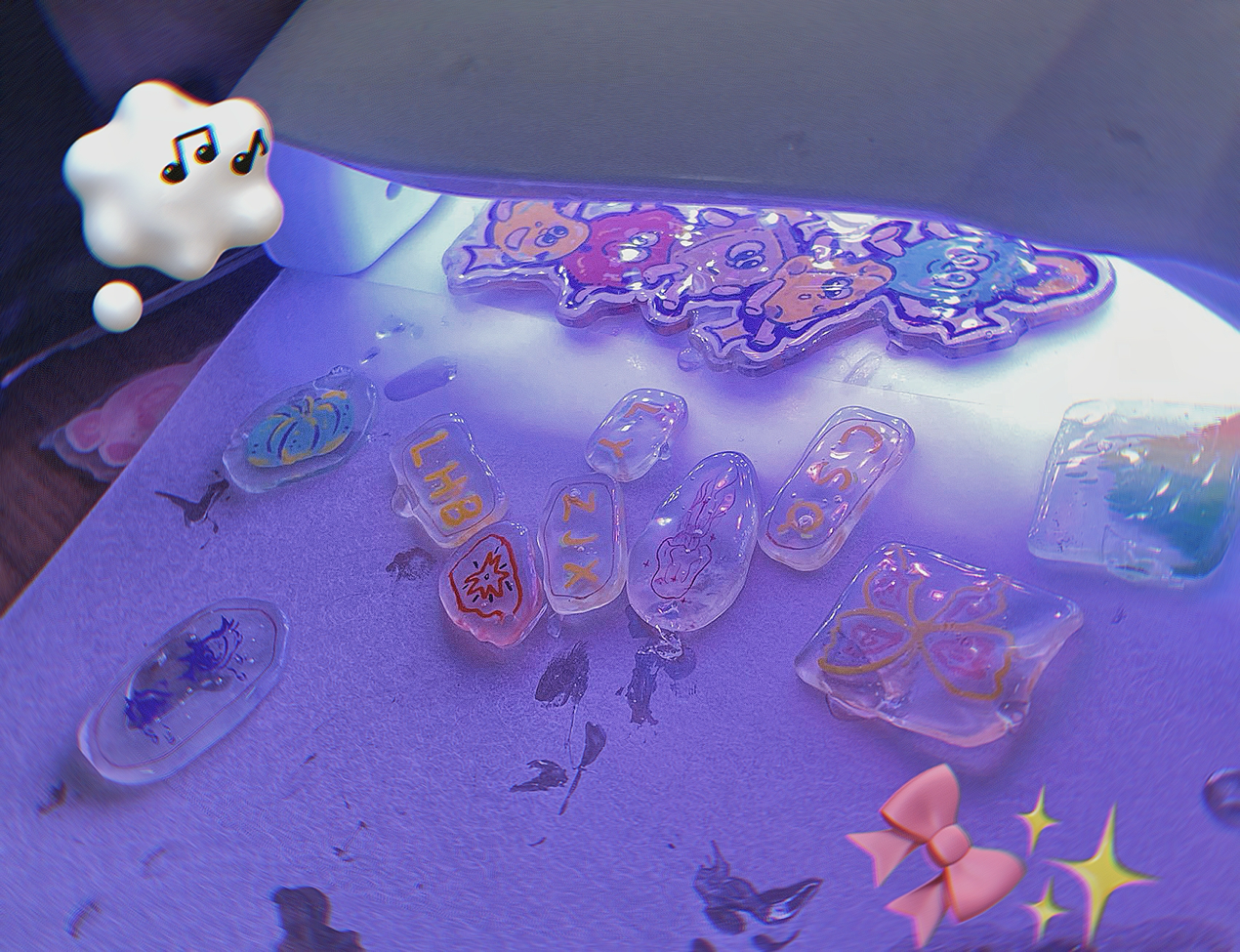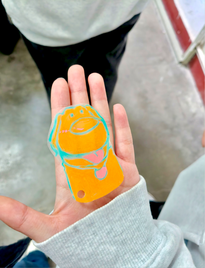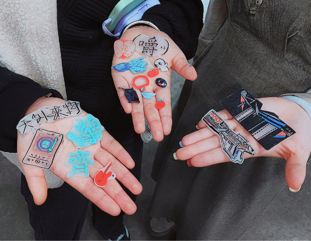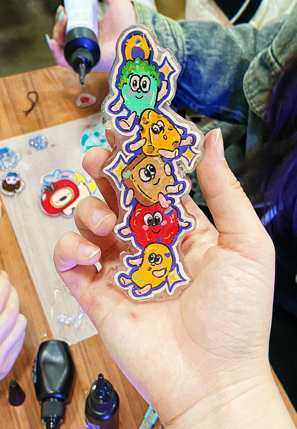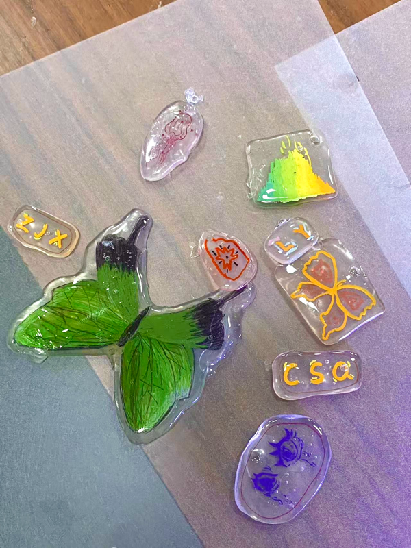 随后,大家根据个人兴趣设计了相关图案,如动漫人物等。在精细裁剪和热缩处理后,一件件色彩鲜艳、创意十足的热缩片作品完成。
