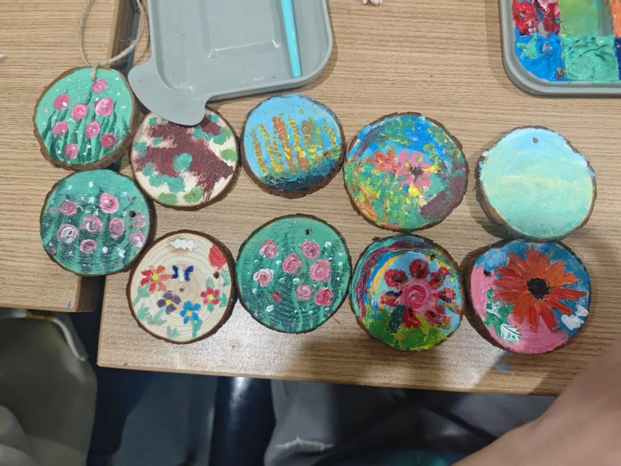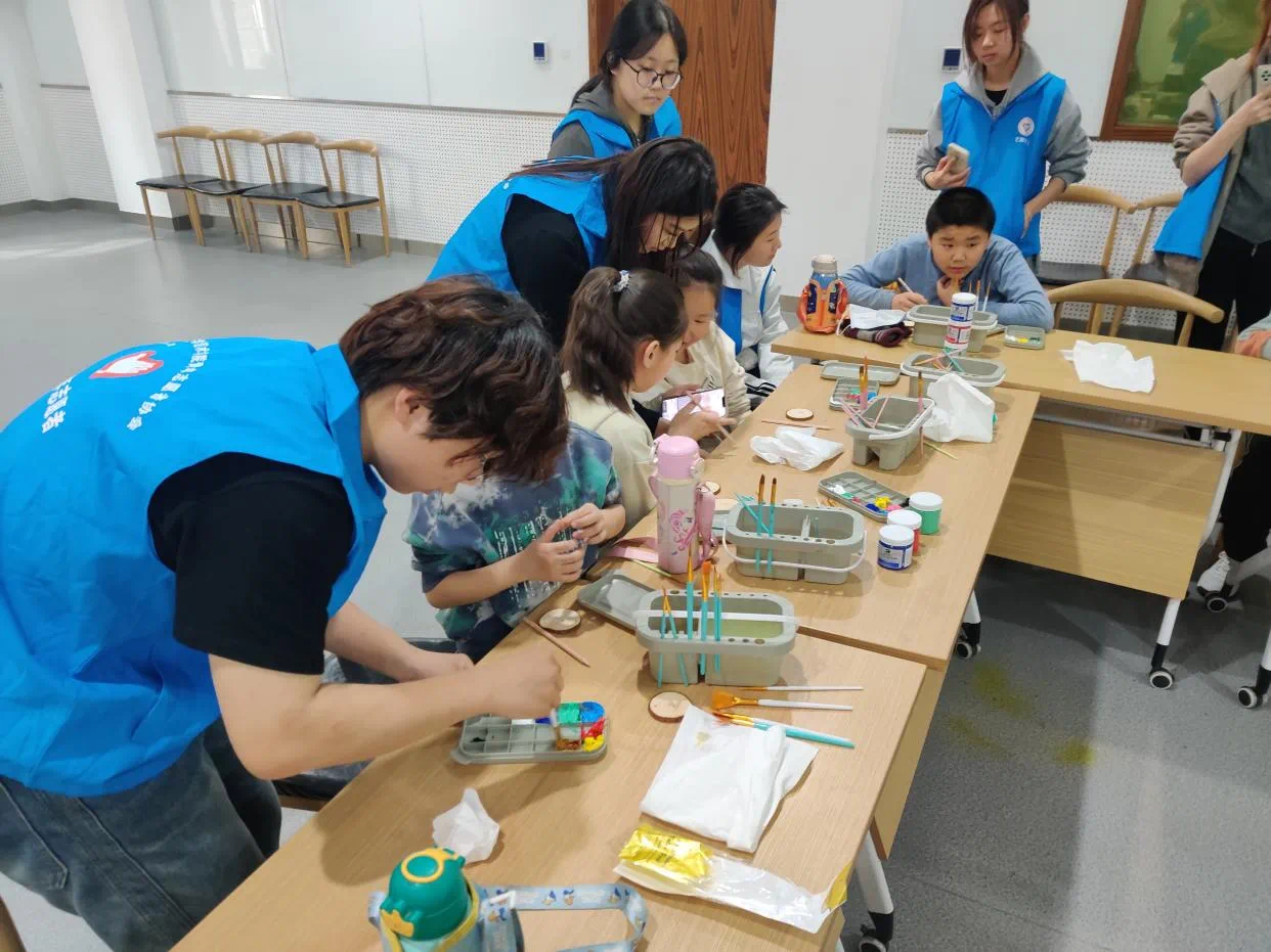 为了给小朋友们营造一个充满艺术氛围的创作空间,志愿者们在活动开始前精心准备了各种绘画工具。本次活动主要使用丙烯进行绘画,以木桩为载体,对春日风光进行绘画,激发创造力与想象力,同时为他们成长带来多方面的积极影响。