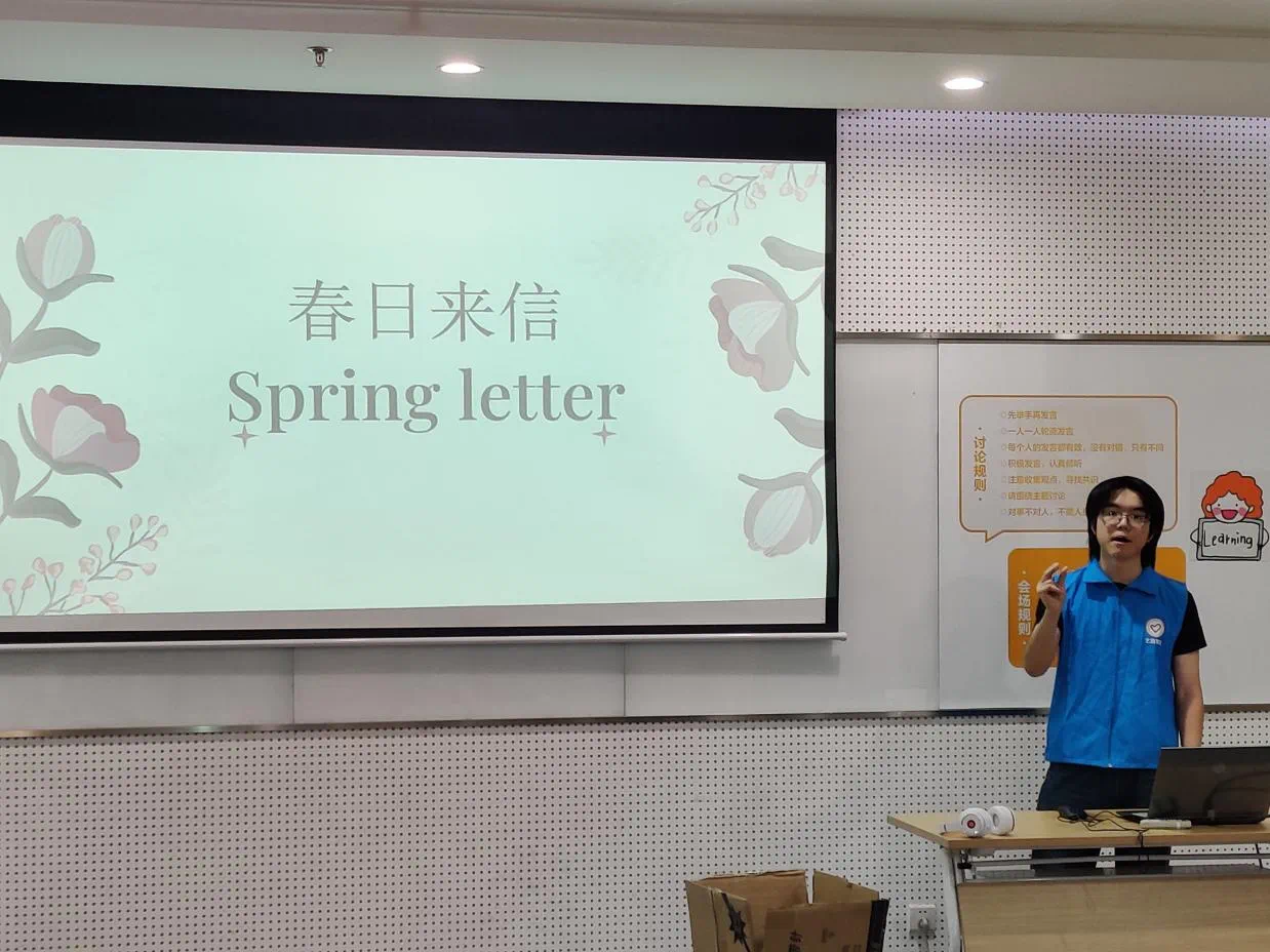 志愿者乔博远对为小朋友们对本次主题进行讲解。活动以“春日来信”为主题,志愿者们鼓励小朋友发挥想象将观察到的春天的自然景色用画笔描绘出来,从而激发他们的创造力和想象力,让小朋友们能自由地表达自己内心的想法和情感。