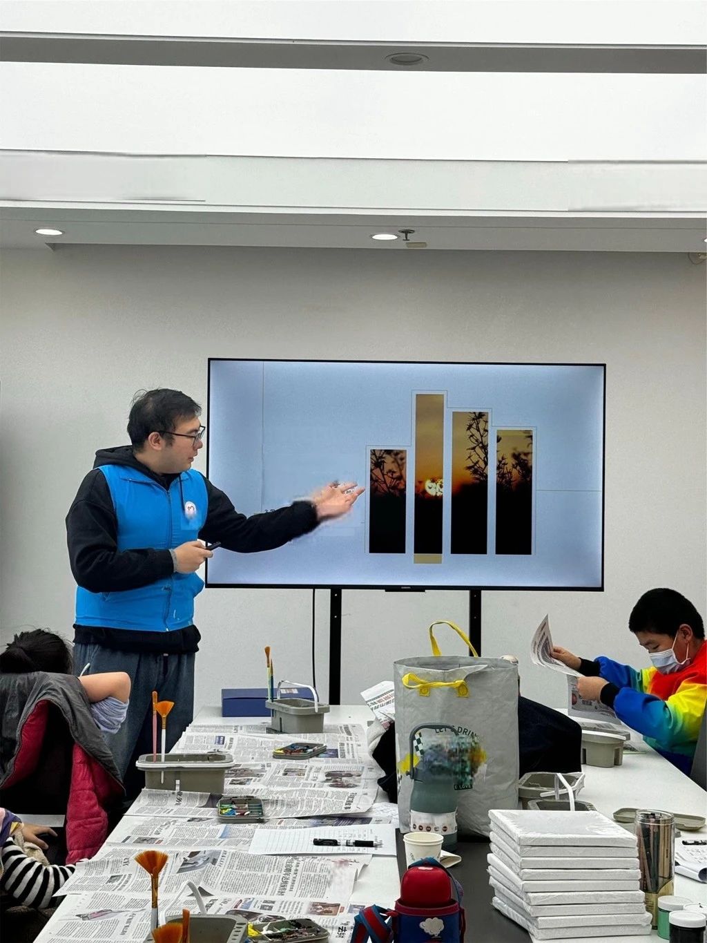活动当天, 孩子们在志愿者的指导下,去创作心中的夕阳景象,将天边的绚烂色彩转化为纸上的艺术表达,激发想象力的同时感受自然之美。