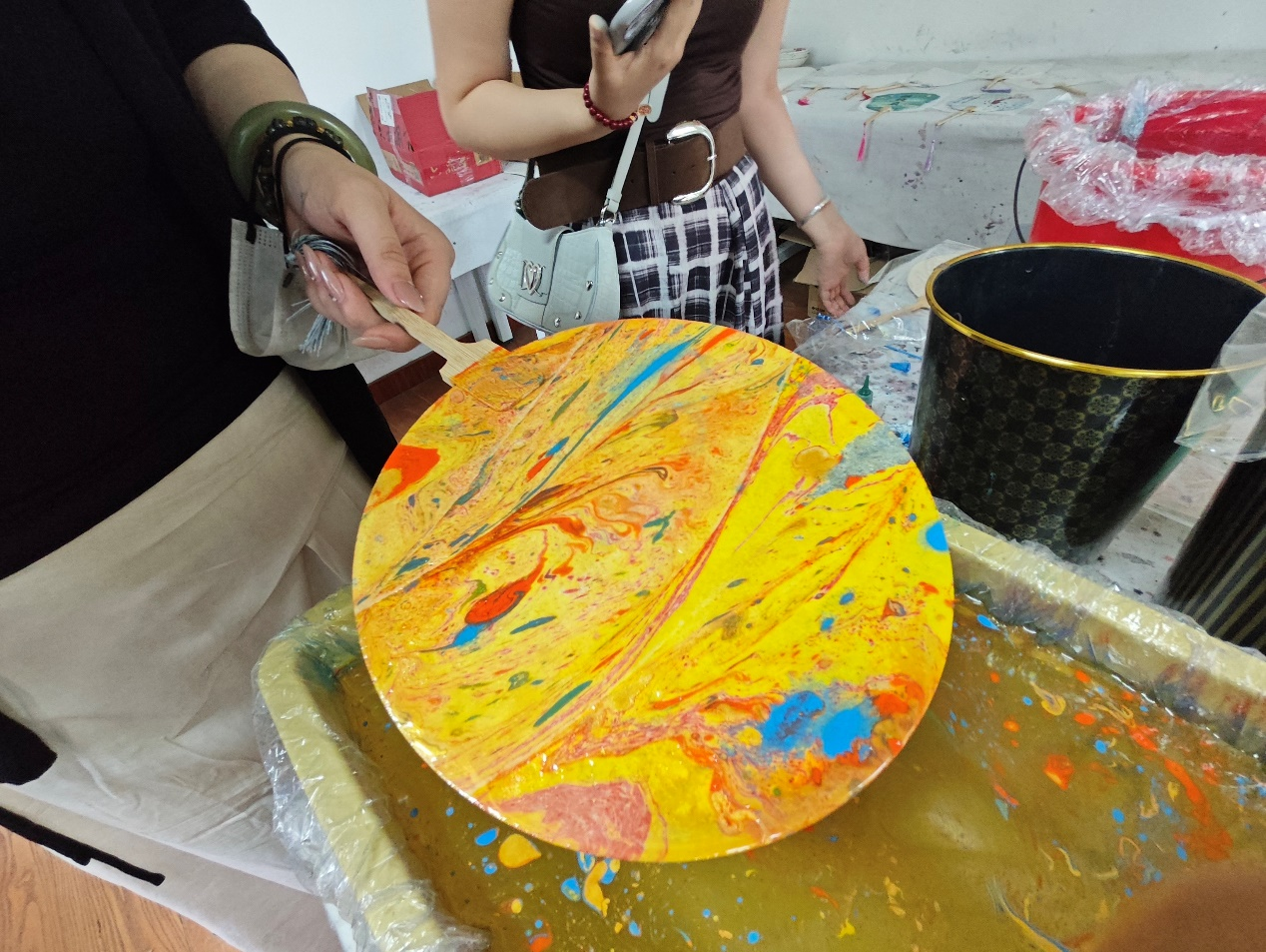 活动现场,气氛宁静而专注。学生们围聚在水盆前,屏息凝神,指尖悬停在水面之上,仿佛在进行一场与水的无声“对话”。美术学院的王梦瑶同学以指尖的温度牵引漆料流动,小心翼翼地调整滴入水中的漆液浓度与角度,连呼吸都轻了三分,只为捕捉漆料在水面晕染的完美瞬间。教室内,专注的神情洋溢在每位参与者脸上,他们灵活地运用搅动、提拉等技巧,让五彩的漆料在扇面上自然形成纹理。