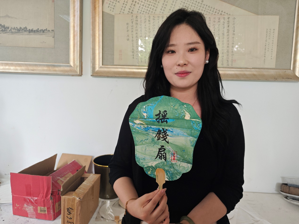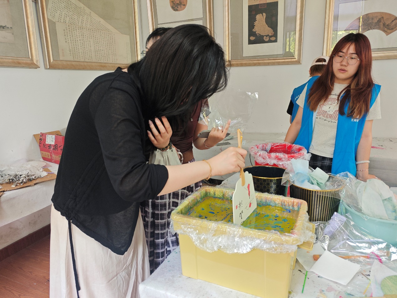 即使效果未达理想,同学们也毫不气馁,重新入水尝试,最终让扇面上“绽放”出心中构想的山水花鸟。美术学院的樊昊天将漆扇技艺喻为“流动的诗篇”,他凝神静气地引导漆料流动的姿态,让旁观者深切感受到传统工艺中蕴含的静谧美学力量。