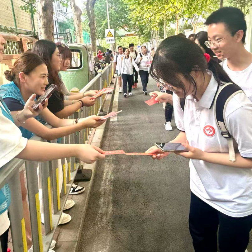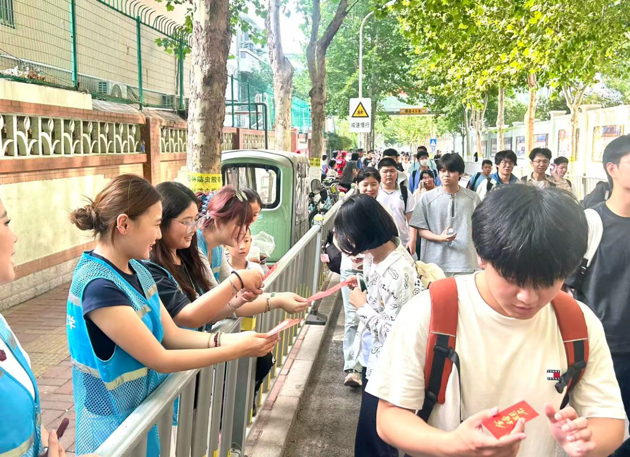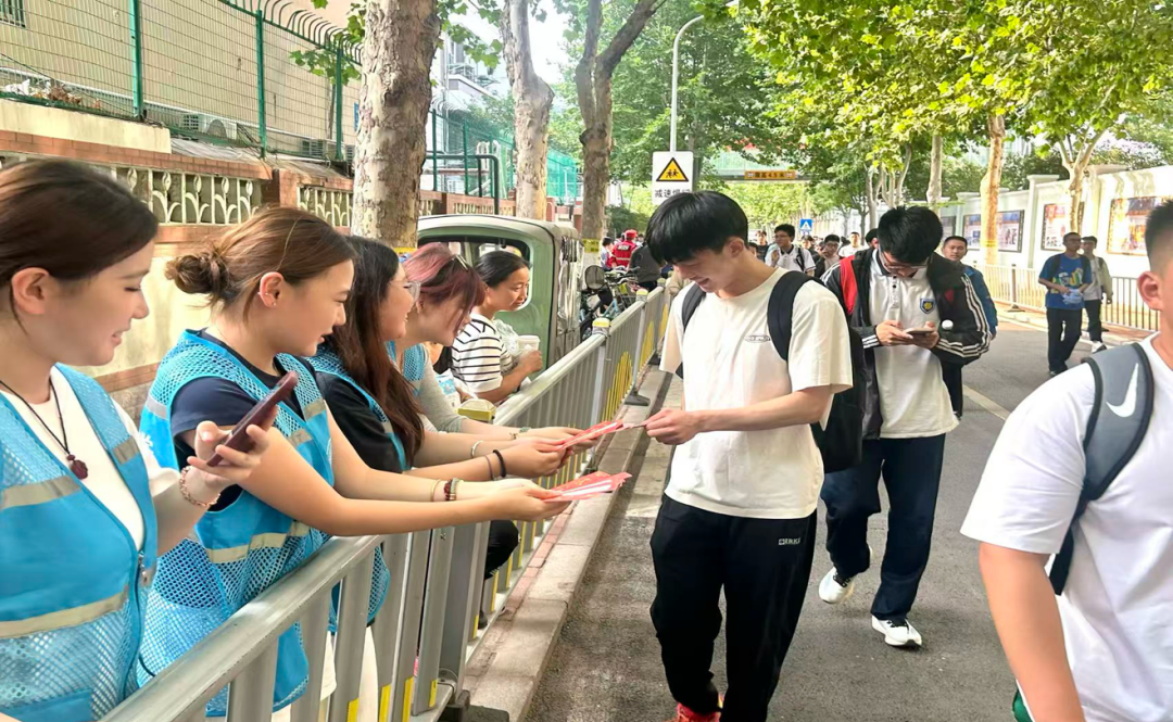 此外,美术学院社团部利用部分义卖资金参与高考助力活动。高考期间,我院社团部为考生准备了矿泉水与助力书签,在考场外,与考生家长一起耐心陪考,等待考生出考场。当考生们走出考场时,社团部同学为考生送上水和书签,书签上写满了对考生的鼓励寄语,为他们送上了夏日的祝福。