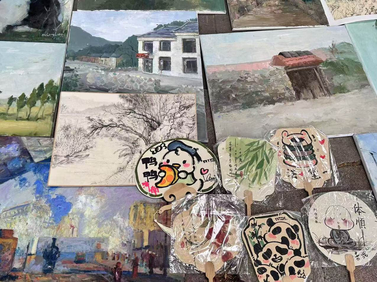 活动展售现场,百余件作品错落陈列,涵盖了国画、油画、水彩及手工艺作品等,每件作品都融入了同学们对艺术创作的深刻思考。为提升活动参与度,美术学院采用“线上展播+线下体验”双线联动的创新模式,通过线上短视频与图文直播的方式展示作品细节。