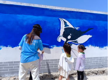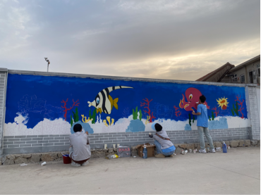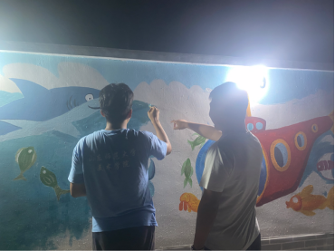 我院青年学生用自己的耐心、热情投入墙绘工作中,取得了良好效果。打底稿需要在天黑之后,用投影仪在墙面投射出已经设计好的图案,后用彩色粉笔在墙面描绘出图案的线条和边缘,待到白天再行上色。从打稿、上色到修边,每一步耐心刻画的是效果,每一笔专注精修的是细节。志愿者们保持战斗热情,勾线起稿、立面粉刷、精描线稿、调和颜色、上墙涂色,一笔一画皆风景。实践小队的志愿者们克服困难,结合海岛实际,围绕“党建引领、渔业发展、乡风文明、渔村特色”等主题进行绘画。