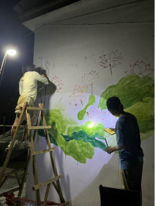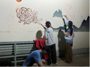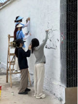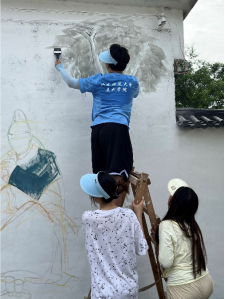 尽管这是志愿者们第一次下乡,并且天气炎热难耐,志愿队仍全身心投入,挥动画笔,参与这世界上最美妙的创作之中。汗水很快浸湿了所有人的衣襟,但志愿者们毫不在意,也不曾受到外界的干扰,对于艺术的执着与忠诚,志愿者们体现得淋漓尽致。