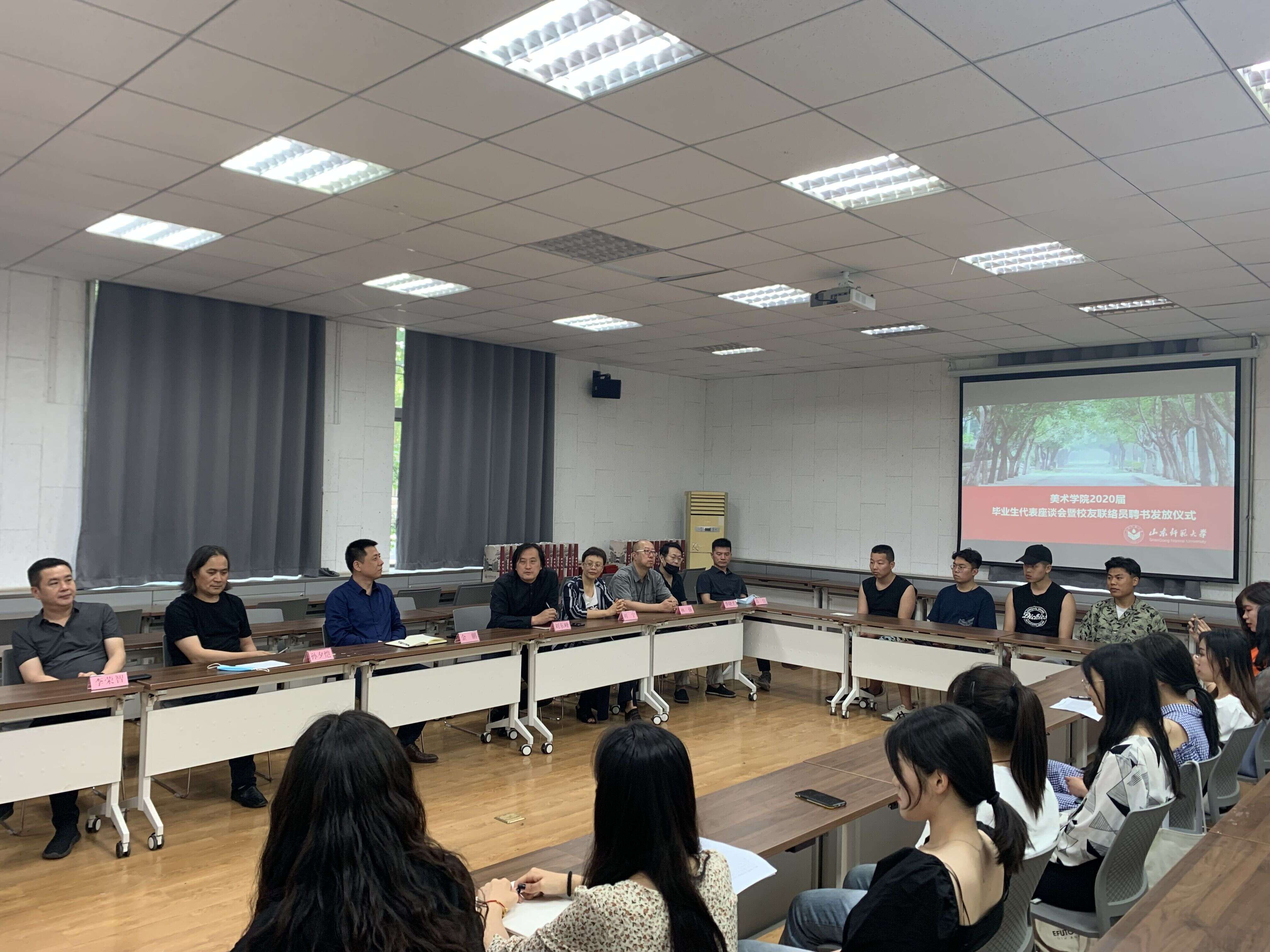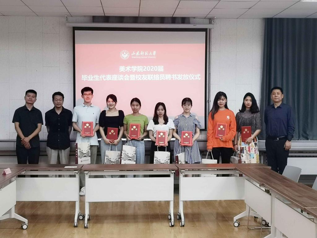 辅导员马骏姣宣读了美术学院2020届校友联络员名单,此次共有22名毕业生被聘为山东师范大学美术学院2020届校友联络员。