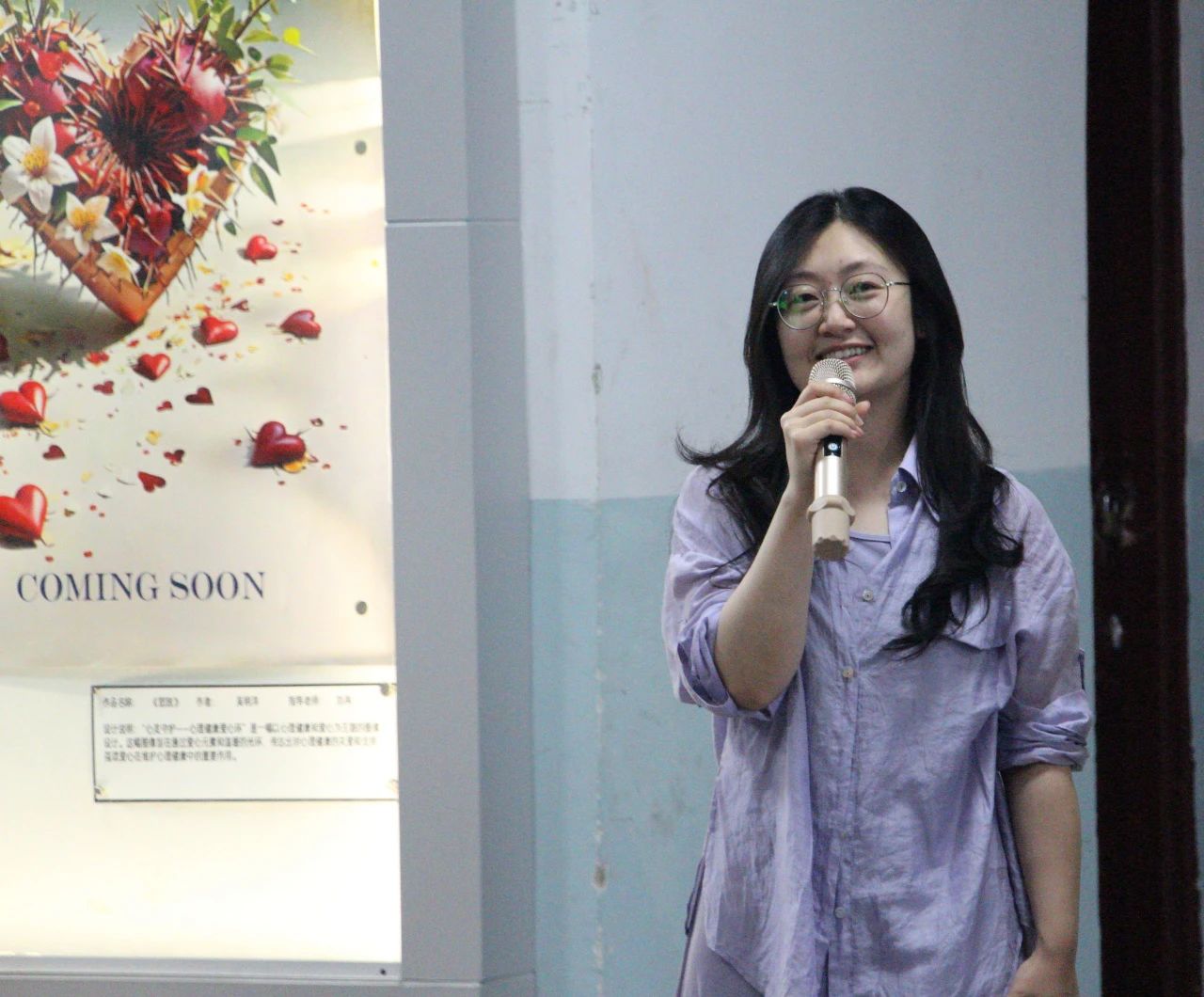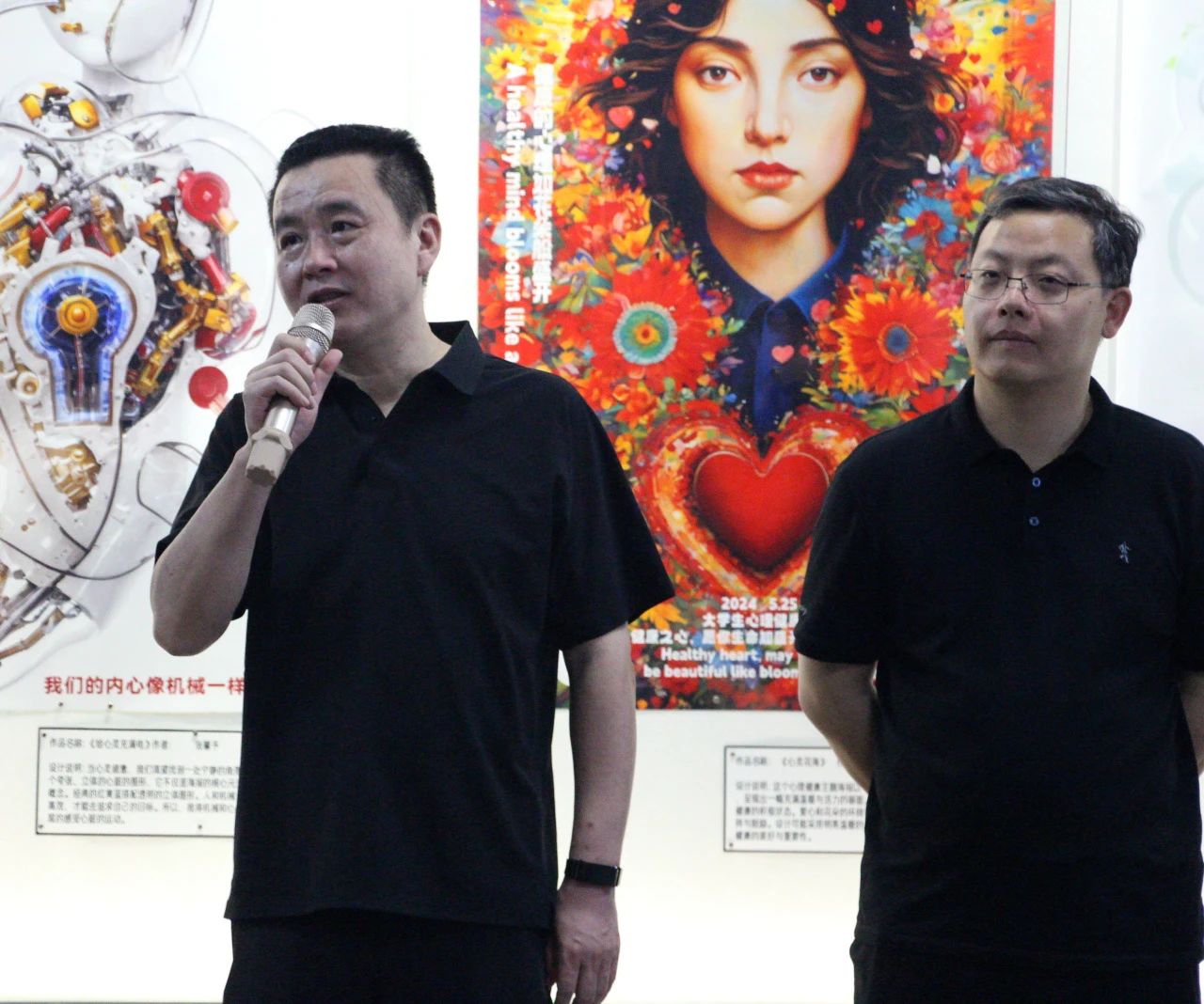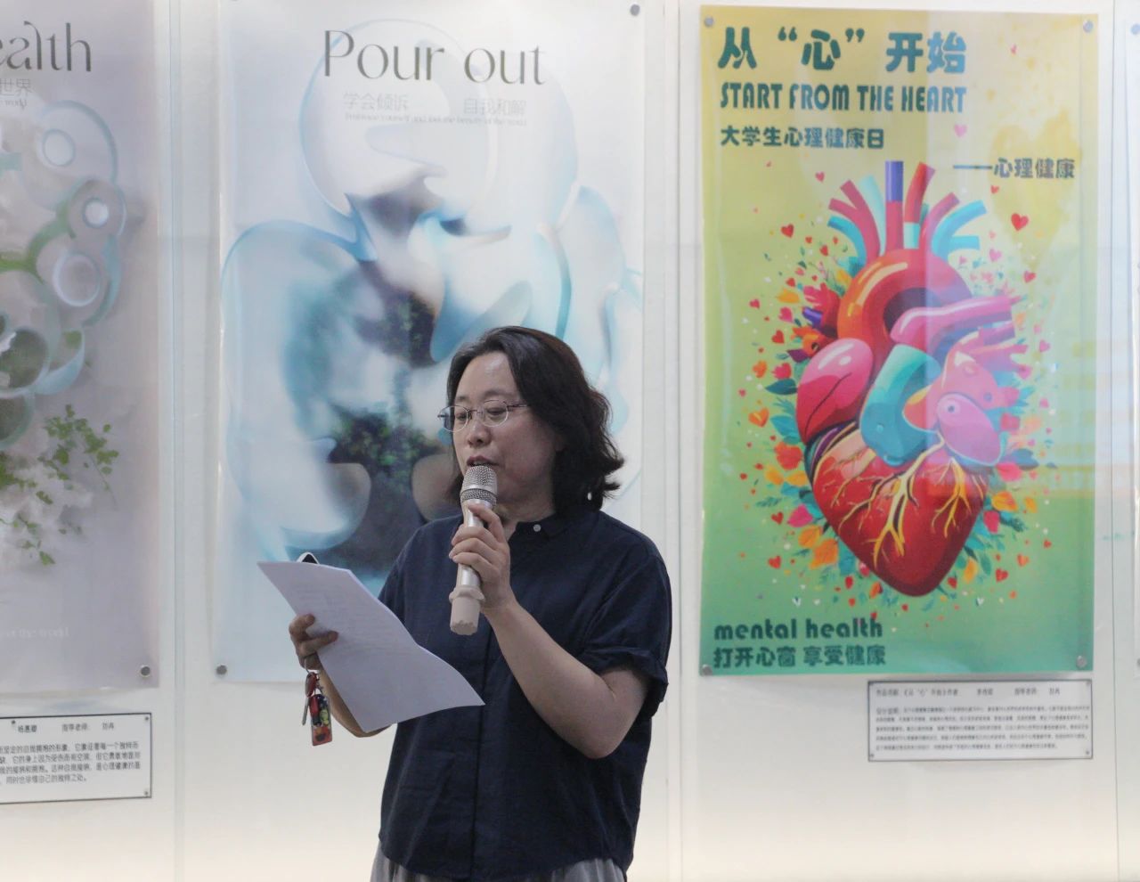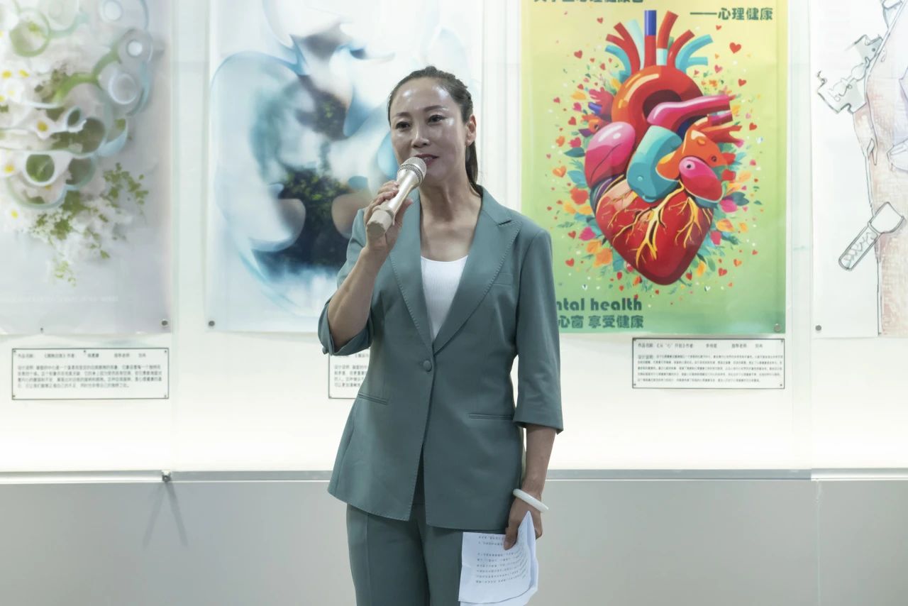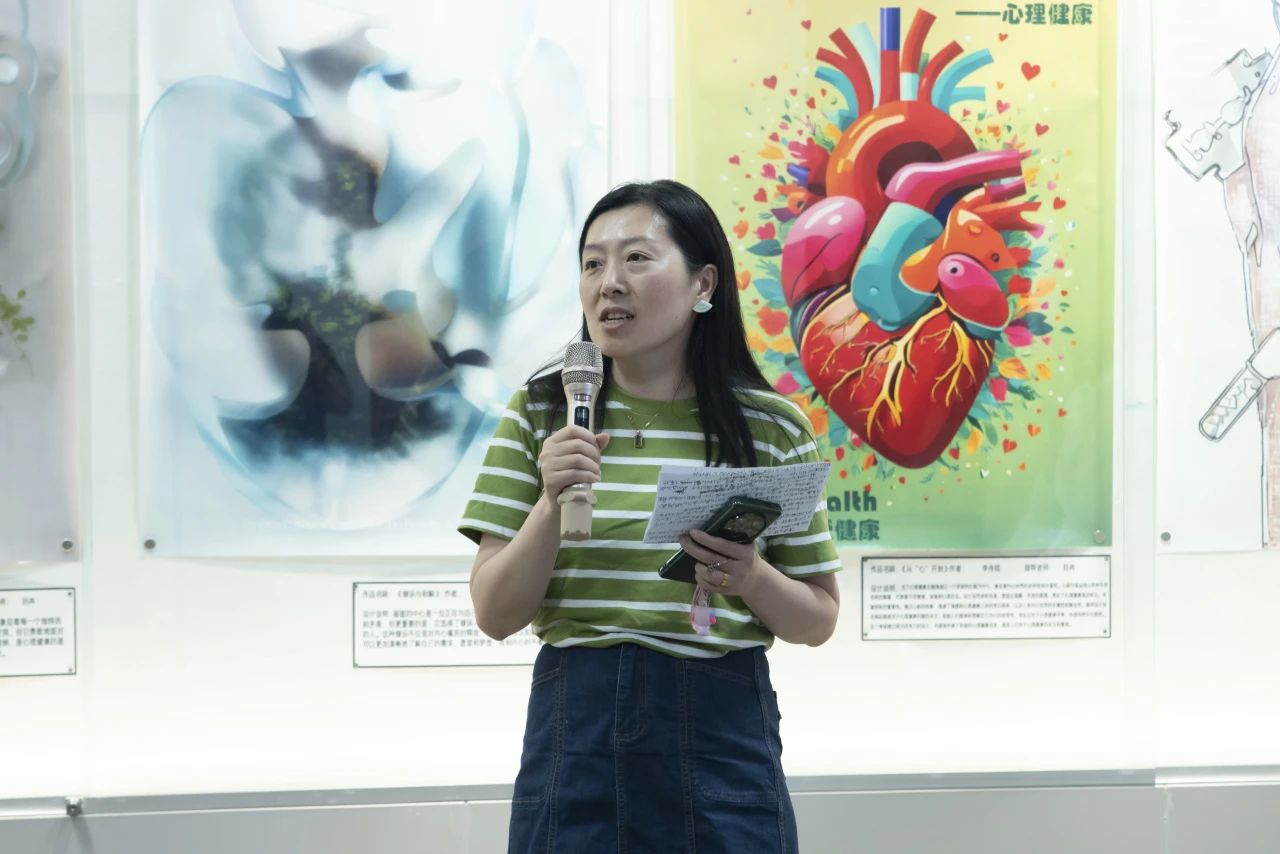 接下来,设计系副主任、图形创意课程主讲老师刘冉发言。她表示,心理健康是每个人都应该关注的重要问题,而艺术作为一种独特的表达方式,能够跨越语言和文化的障碍,将心理健康的理念传递给更广泛的人群。在图形创意课程中加入最新的AI技术,对老师和同学们是一次创新也是一次挑战。同学们在使用AI技术制作海报中克服了种种困难,历经各种磨练,利用短短三周时间高质量地完成了三百多幅作品。