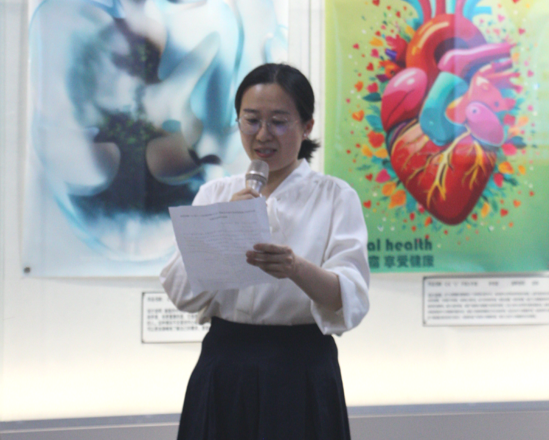 开幕式伊始,由美术学院党委副书记葛晓霞致辞,她首先对学生工作部史彩虹和学生心理健康教育中心两位老师一行的到来表示热烈的欢迎,对学工部一直以来对我院学生工作的支持表示感谢。她详细地介绍了此次展会的内容,学院发挥专业特色,创新心理育人模式,将心理教育与专业教学相融合。美术学院高度重视学生心理健康教育工作,学院团委组织了一系列学生活动在全院开展心理健康教育。通过此次展览,能够引导全院学生关注心理健康,学会用积极的心态面对生活中的挑战和困难。