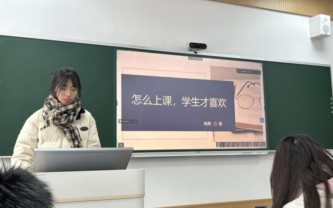 尹佳琦同学分享了魏勇的《怎么上课,学生才喜欢》一书,主要从“千万不要忘记自己曾经是学生、好课的标准是什么、学生喜欢什么样的老师、如何成为这样的老师”四个部分加以介绍,最后结合所读内容分享了自己的感悟和观点。
