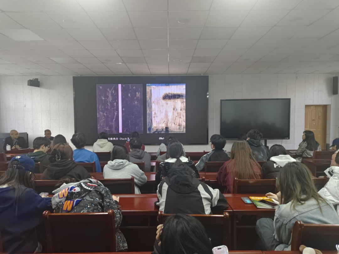 接着,斋藤典彦向同学们讲解了日本画中如何表达光线及空间感,并向同学们展示了横山大观和菱田春草等艺术家的艺术作品,进一步让同学们了解了日本绘画的艺术氛围。