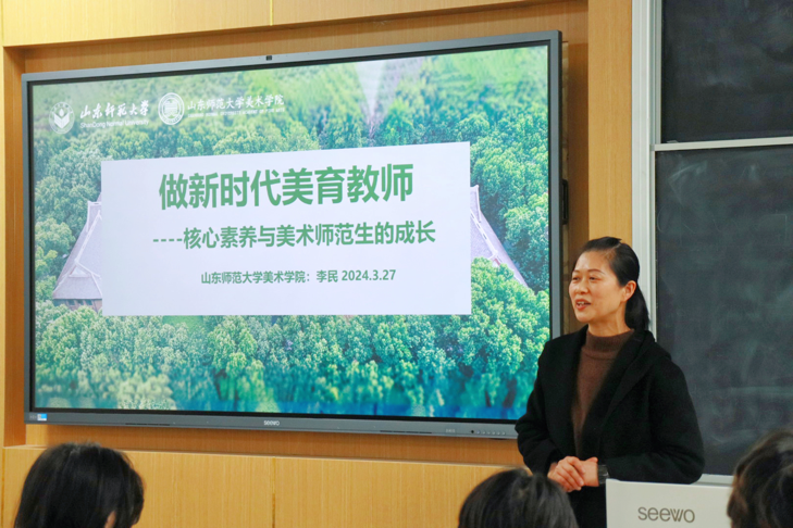 李民院长从分析新时代对核心素养的要求出发,介绍培养美术师范生的目标,以鲜活的案例讲解如何做一名中小学美术教师,同时强调了为了实现目标,学生们需要为之所做的一系列准备。在当前信息飞速发展的时代大背景之下,为贯彻落实党的教育方针、政策和适应国家高等教育发展需求,美术师范专业应培养多学科综合能力人才,顺应新时代基础教育事业发展对美术人才的需求。