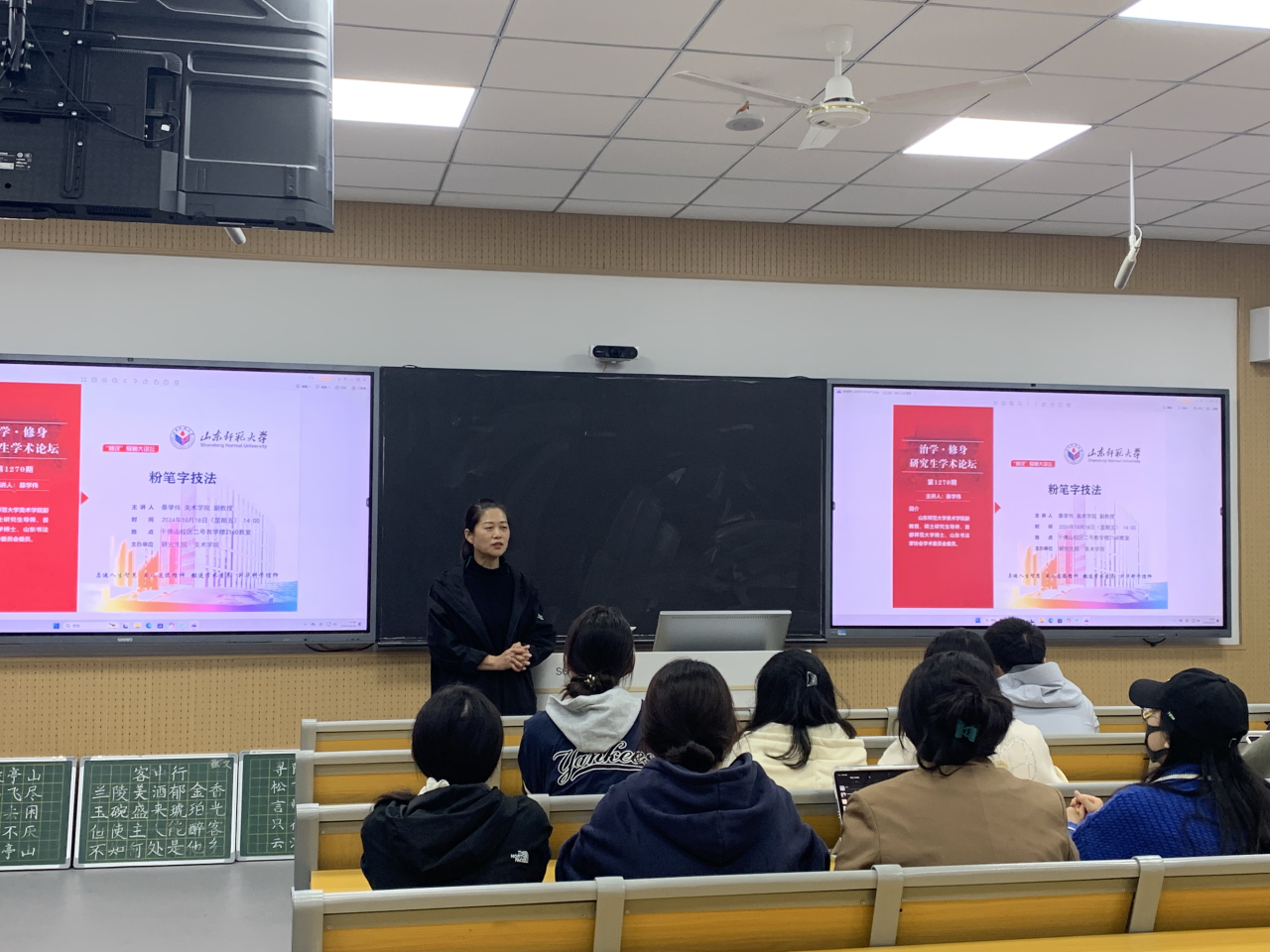 10月18日下午,美术学院于山东师范大学二号教学楼2160教室举办“粉笔字技法”为主题的讲座活动,美术学院副教授、硕士生导师暴学伟老师应邀担任主讲人。美术学院学科教学(美术)专业学位点负责人李民老师及美术学院研究生参与本次讲座。