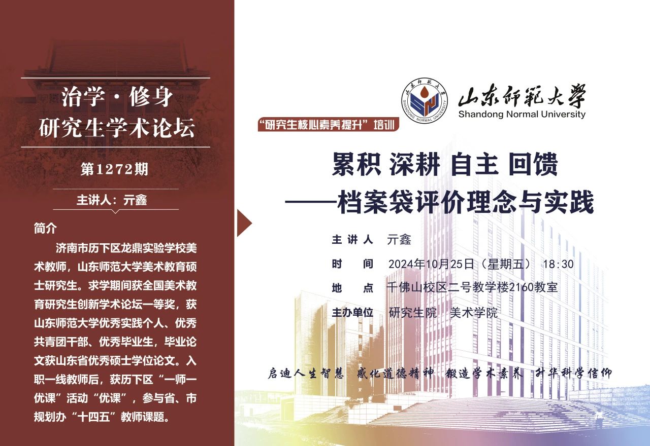 10月25日晚六点半,美术学院于山东师范大学千佛山校区二号楼2160教室举办“累积、深耕、自主、回馈——档案袋评价理念与实践”学术论坛。亓鑫担任主讲人,亓鑫现为济南市历下区龙鼎实验学校美术教师,硕士毕业于山东师范大学学科教学(美术)专业,求学期间曾获全国美术教育研究所创新学术论坛二等奖、山东师范大学优秀实践个人、优秀共青团干部、优秀毕业生,硕士论文被评为山东省优秀硕士学位论文。工作后曾获历下区“一师一优课”活动优课,参与省、市规划办“十四五”教师课题,美术学院部分学生到场聆听。