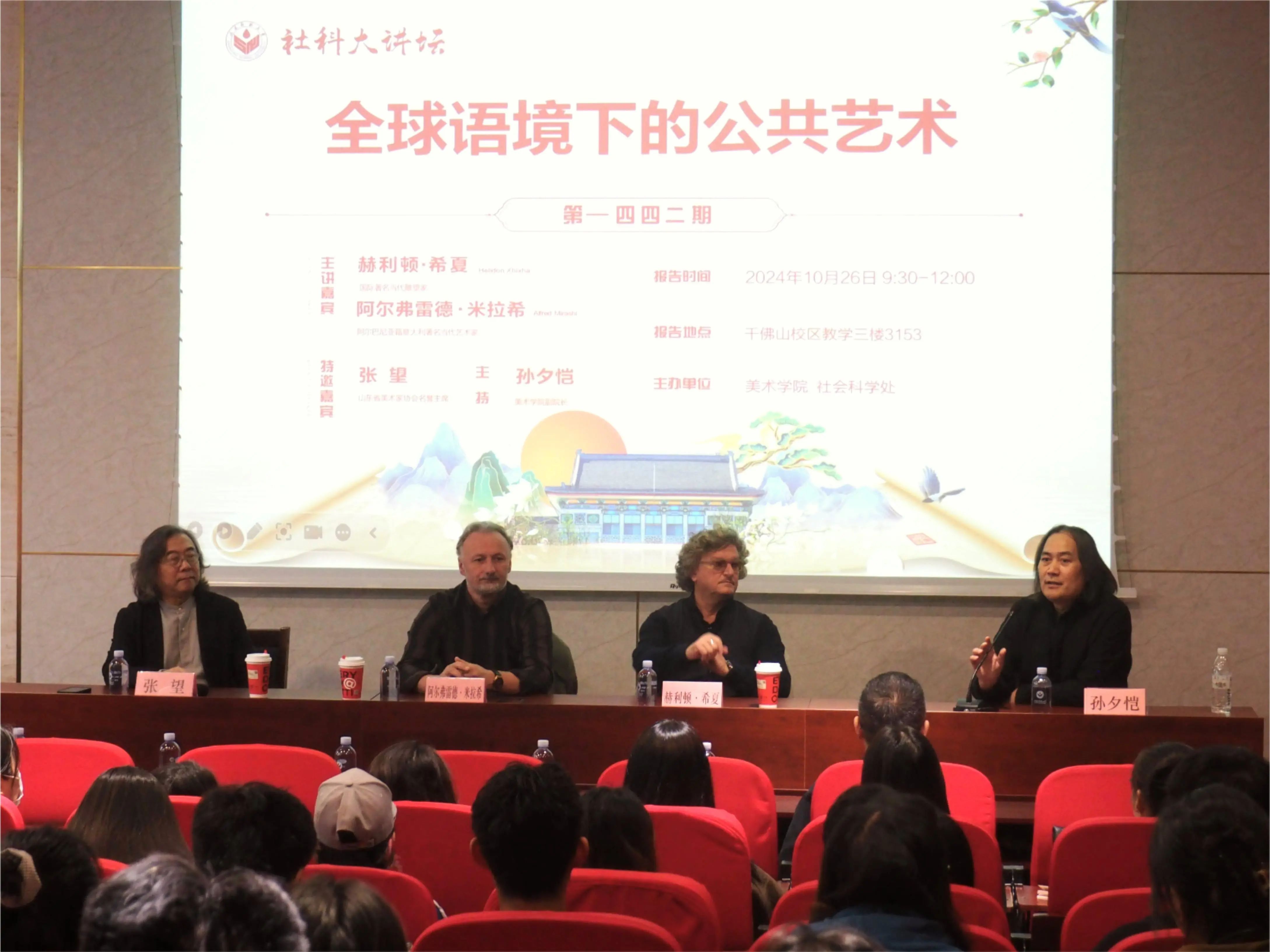 2024年10月26日上午,山东师范大学美术学院、国际交流与合作处、社科处主办的社科大讲坛第一四二二期《全球语境下的公共艺术》在千佛山校区教学三楼报告厅举行。本次讲座邀请了国际著名当代雕塑家赫利顿·希夏(Helidon Xhixha)先生和阿尔巴尼亚籍意大利著名当代艺术家阿尔弗雷德·米拉希·米洛特(Alfred Mirashi Milot)先生作为主讲嘉宾,山东省美术家协会名誉主席张望担任特邀嘉宾,山东师范大学美术学院副院长孙夕恺担任主持。山东师范大学美术学院的全体博士生、硕士生以及部分本科生参加了本次讲座。