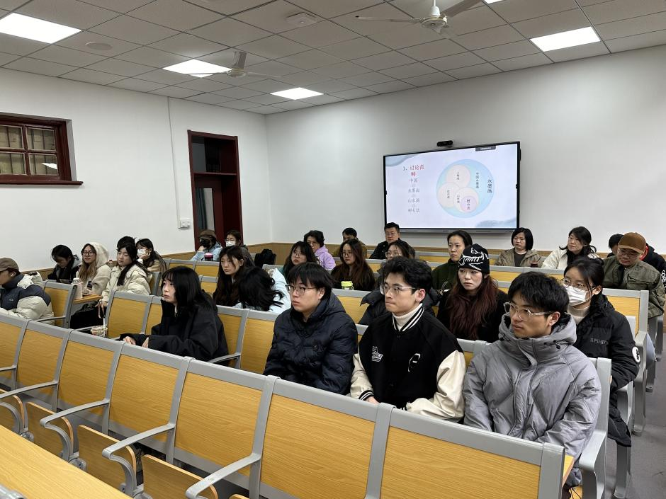 此次课程主要讲解山水画写生传统和写生技法的运用。在课堂展示环节,于海龙老师用“以树石法为例浅谈写生”为题,首先回顾之前的课程、知识、谱系,介绍中国画、水墨画、山水画的范畴关系。随后以古代画论引出中国传统绘画中的写生及山水写生在近现代的发展。又结合经典作品,详细解读山水画写生的观察方法、构图章法、空间布景、笔墨意趣等问题。整堂课学生听讲认真,与教师配合密切,课堂秩序良好。